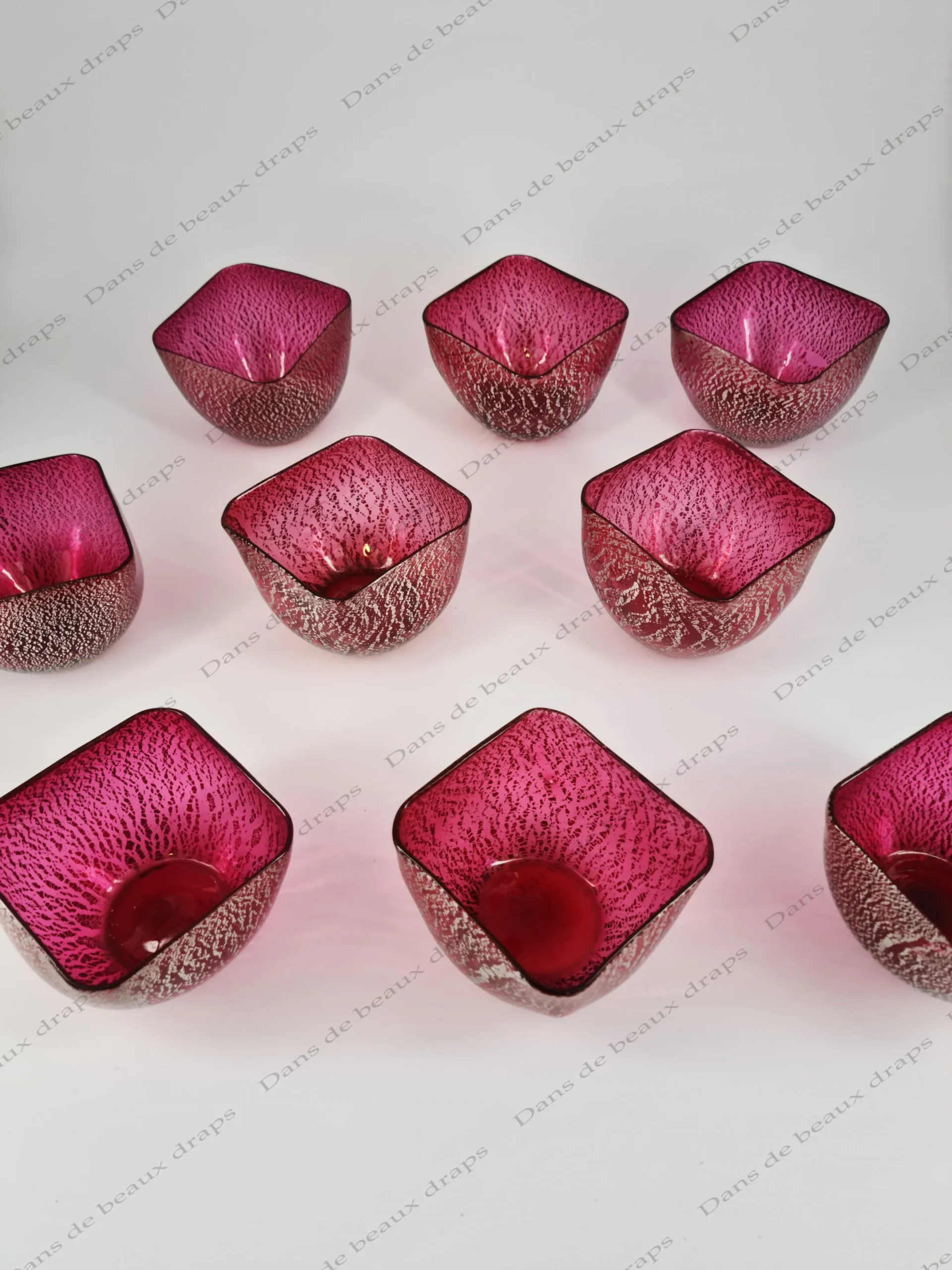 9 belles coupes à dessert en cristal rose vif,peigné argent.