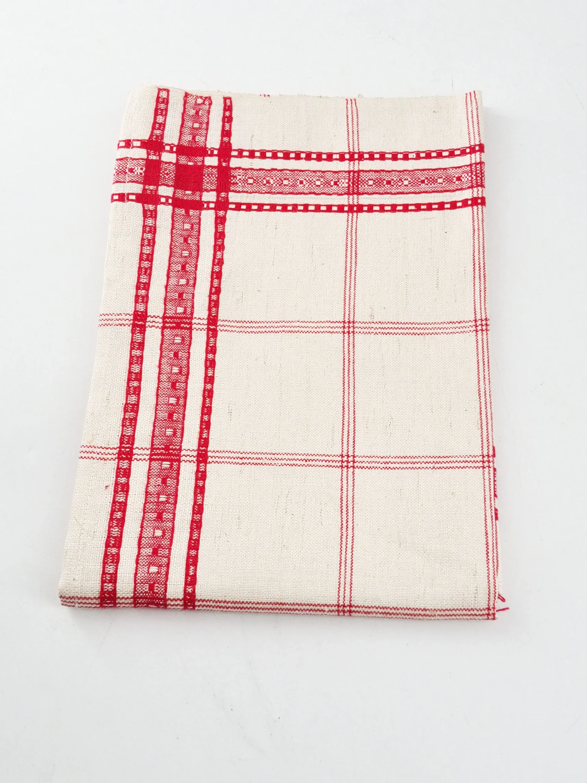 Beau torchon ancien en lin à liteaux rouges.
