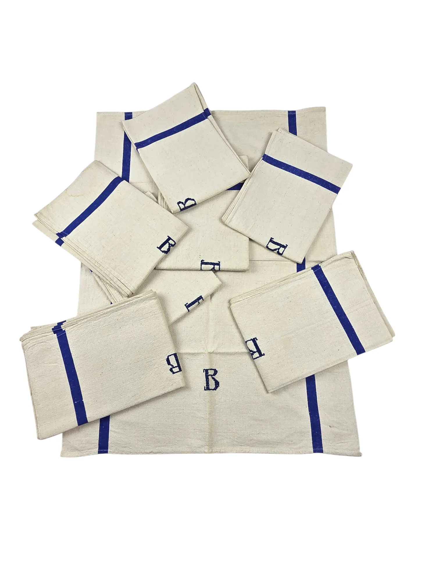 Rare série de 8 torchons en lin liteaux bleus , monogramme B.