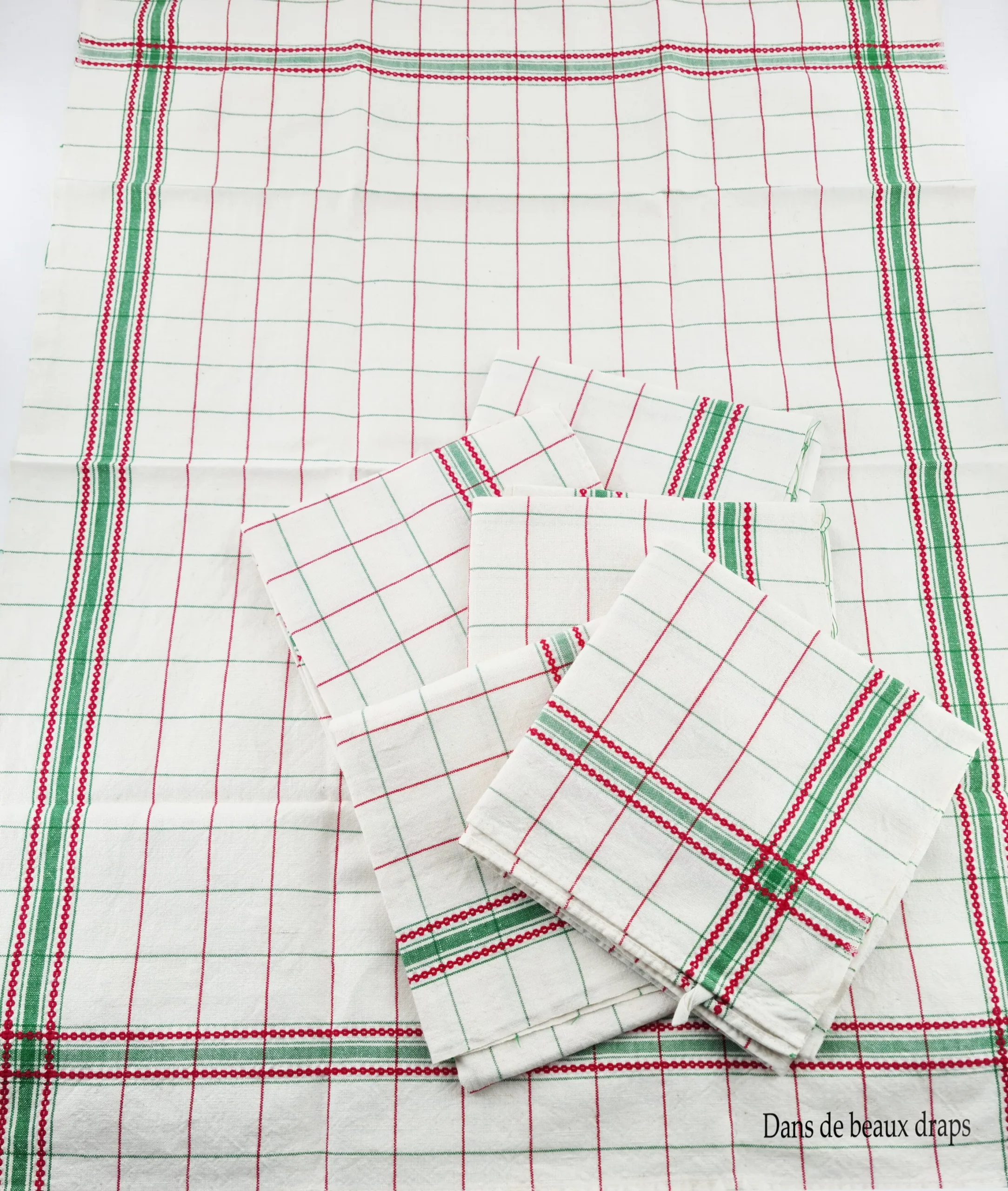 Très belle qualité de toile,décor de quadrillages rouges et verts,bordure à double liteau rouge et vert venant croiser aux angles.