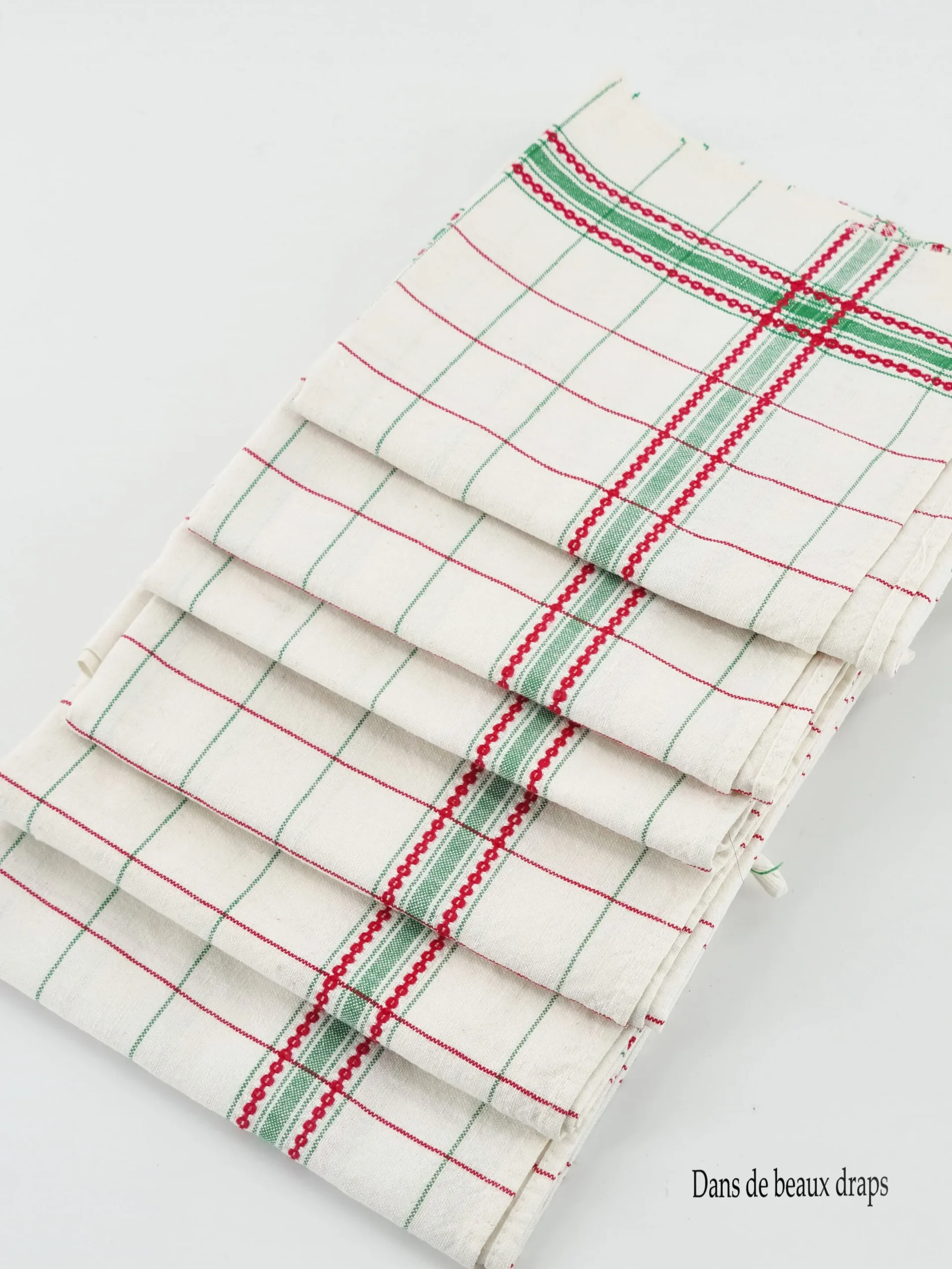 Beau torchon en lin à liteaux rouges et verts.
