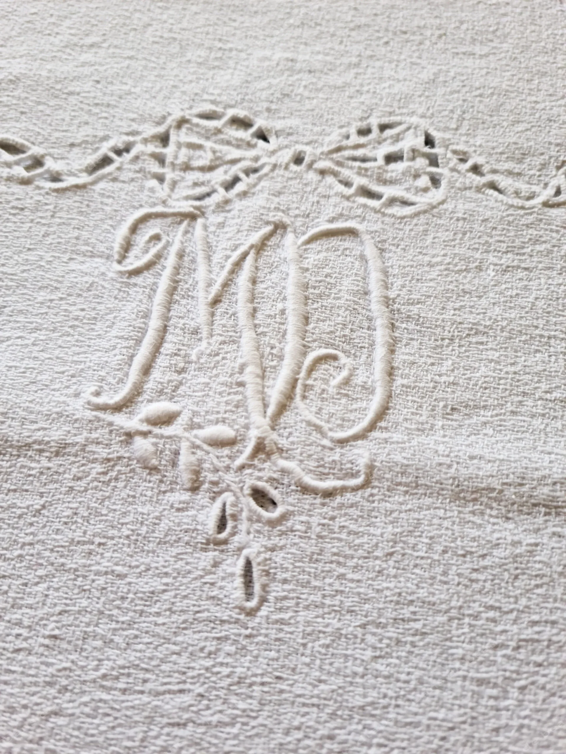 A l’intérieur,en miroir,2 monogrammes MD brodés au point de bourdon (6 cm par 6 cm).