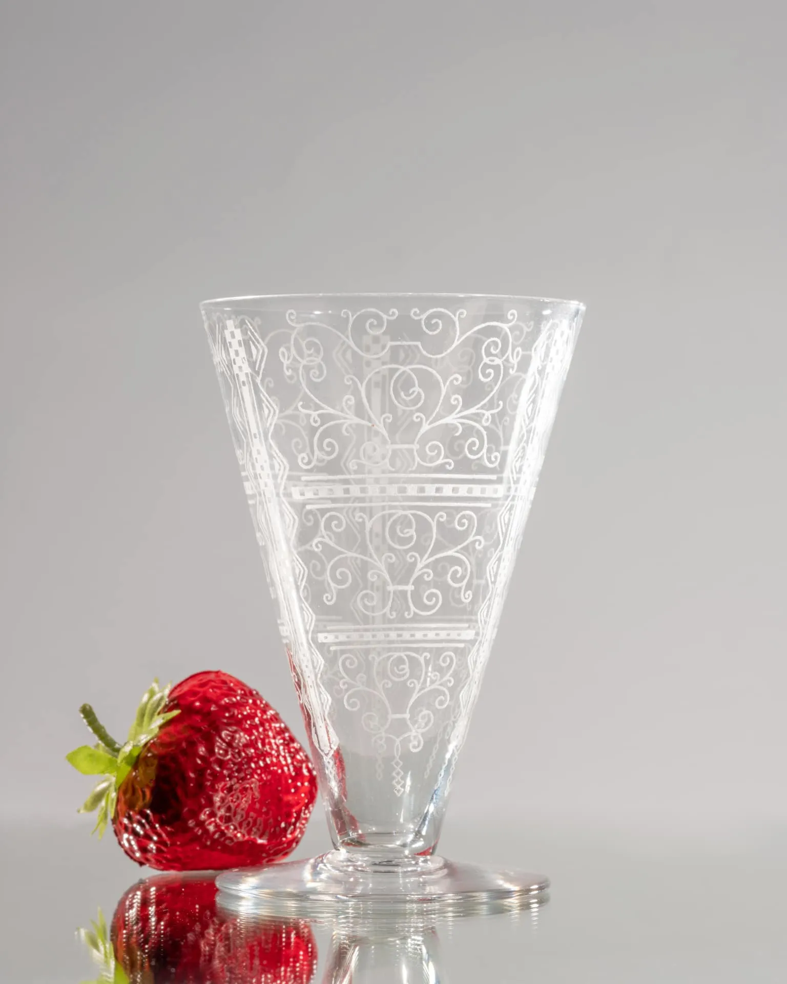 En cristal fin, d’une pureté exceptionnelle, il se caractérise par sa forme conique et son absence de jambe, le pied étant directement collé au calice.