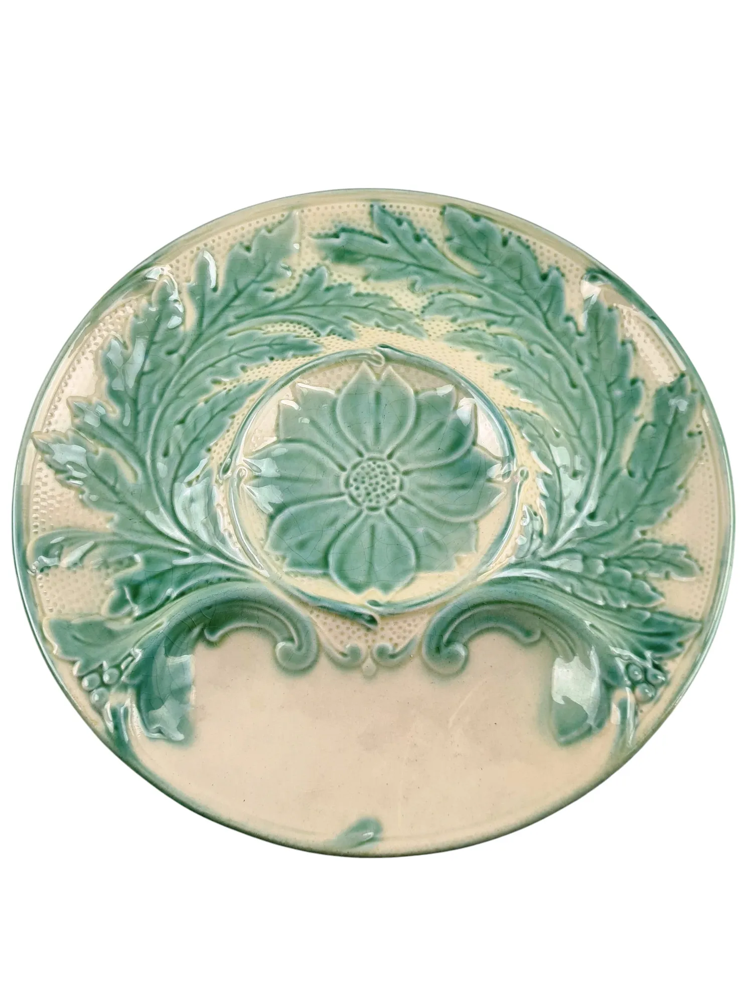 Fond beige, feuilles vert d’eau.