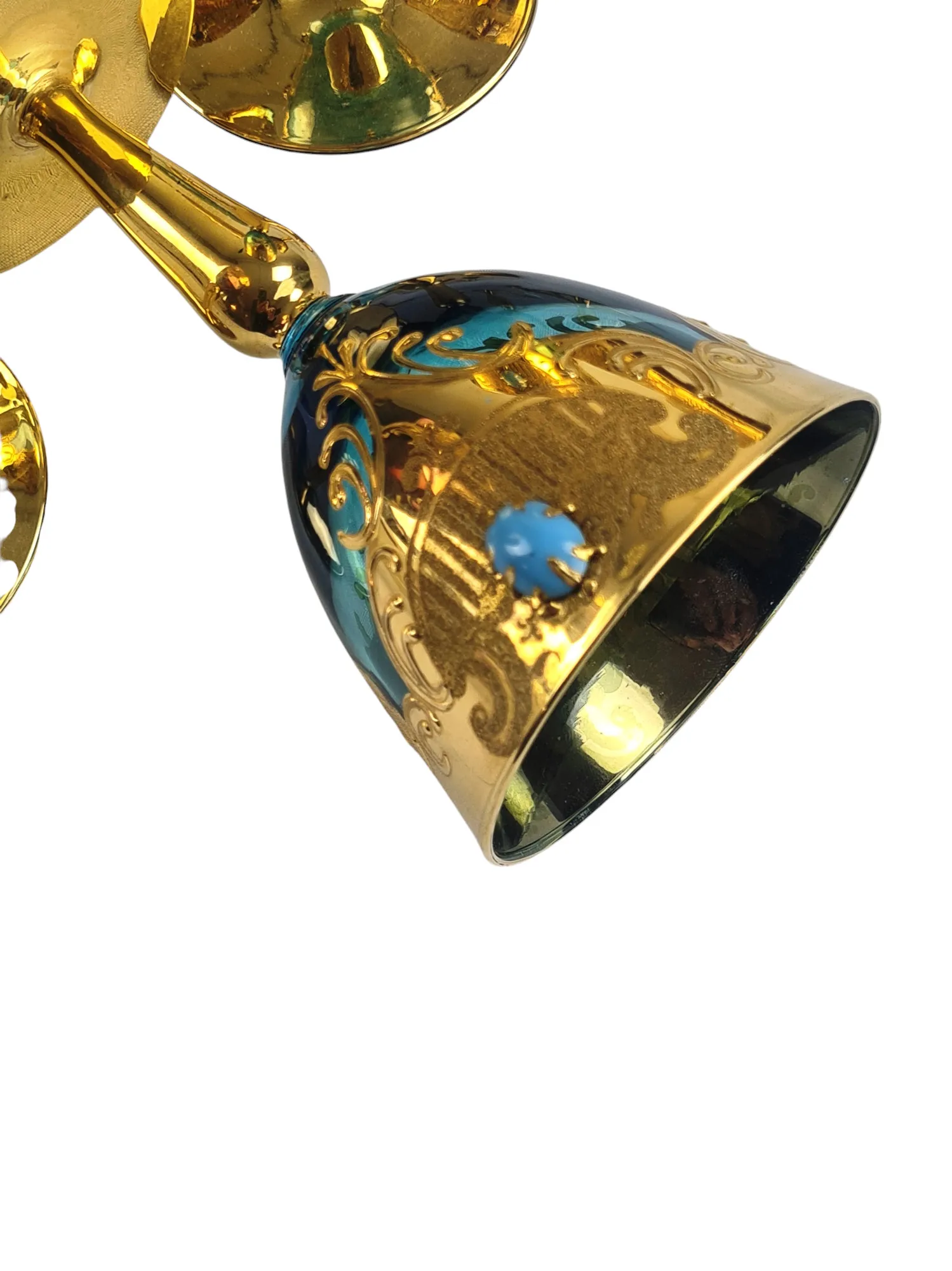Le pied et la jambe dorés, le calice partiellement doré, à décor de volutes et gravé de cabochons de couleurs différentes, à l’imitation de pierres précieuses.