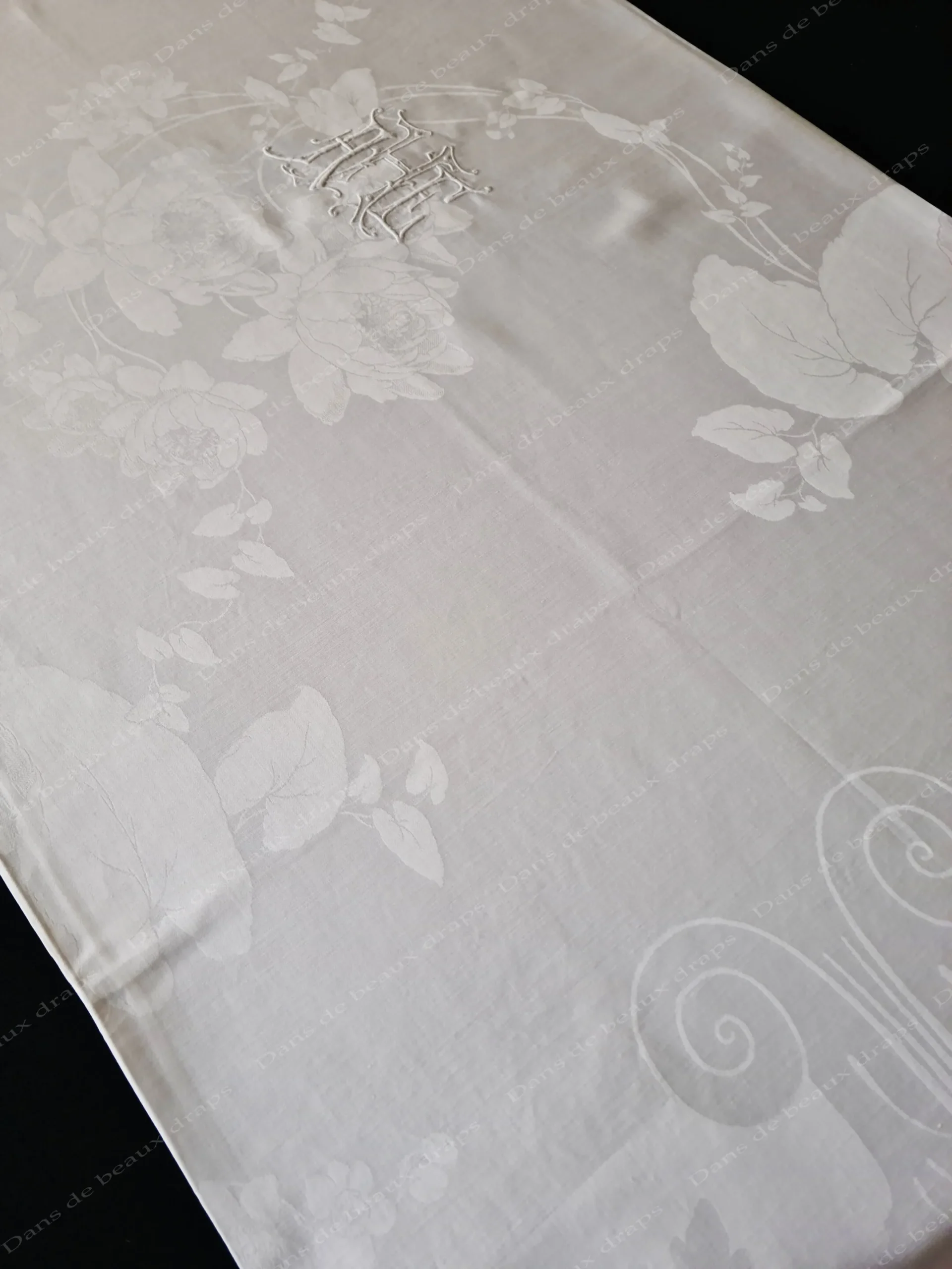 Très belle nappe de buffet carrée en damassé de lin,époque Napoléon III,monogramme AHE.