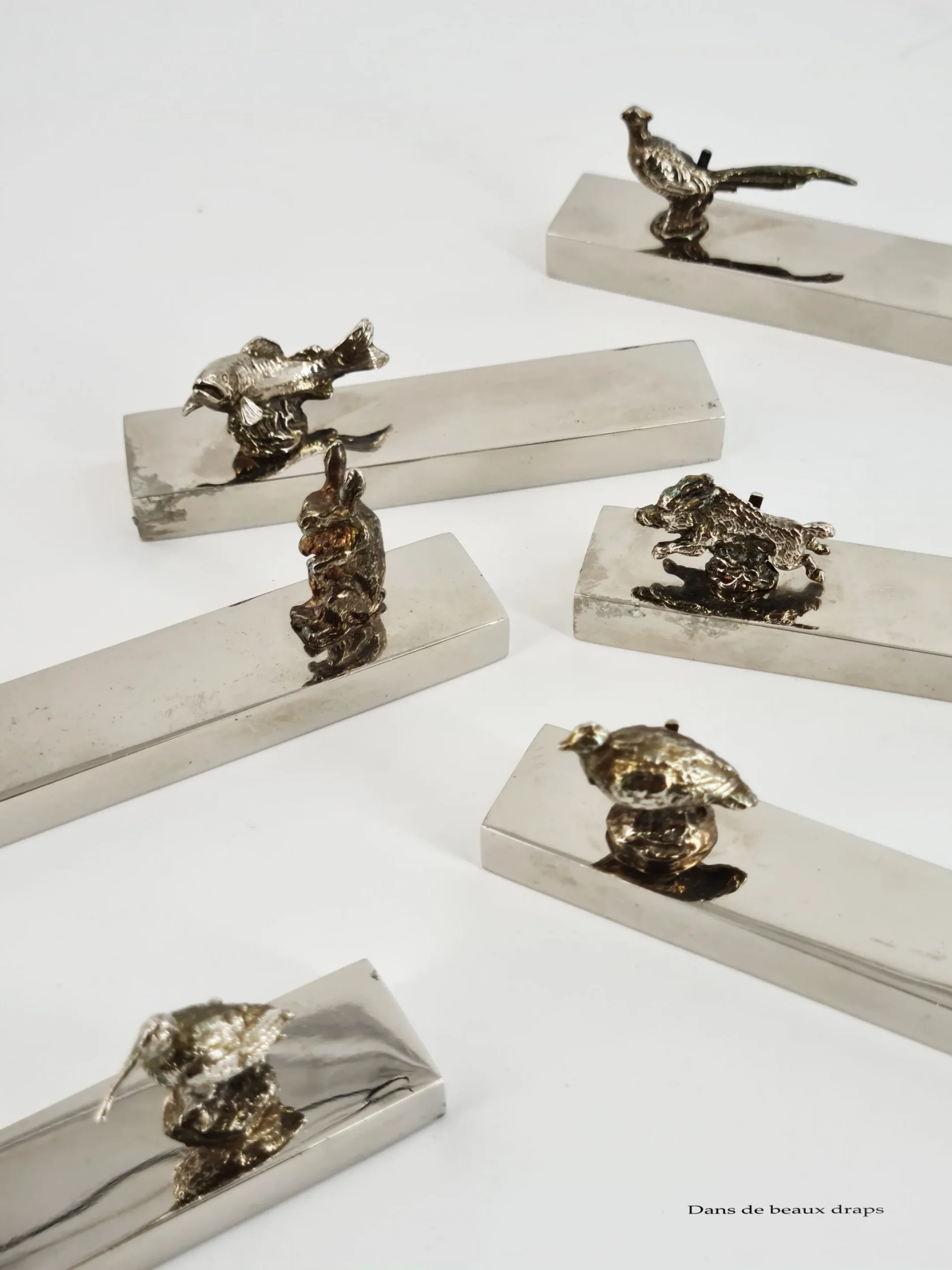 Amusant ensemble de 6 porte-noms, porte-couteaux en métal argenté à décor animalier
