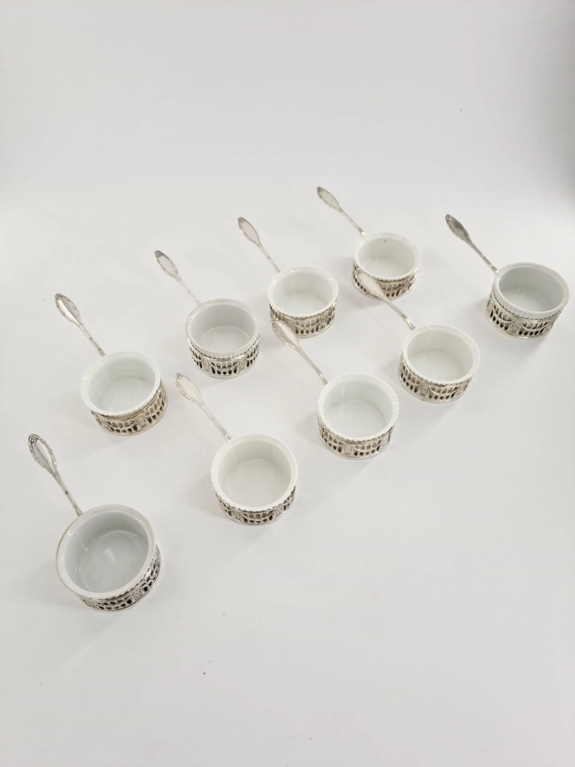 Jolie suite de 9 cassolettes en métal argenté et porcelaine, orfèvre Victor Saglier.