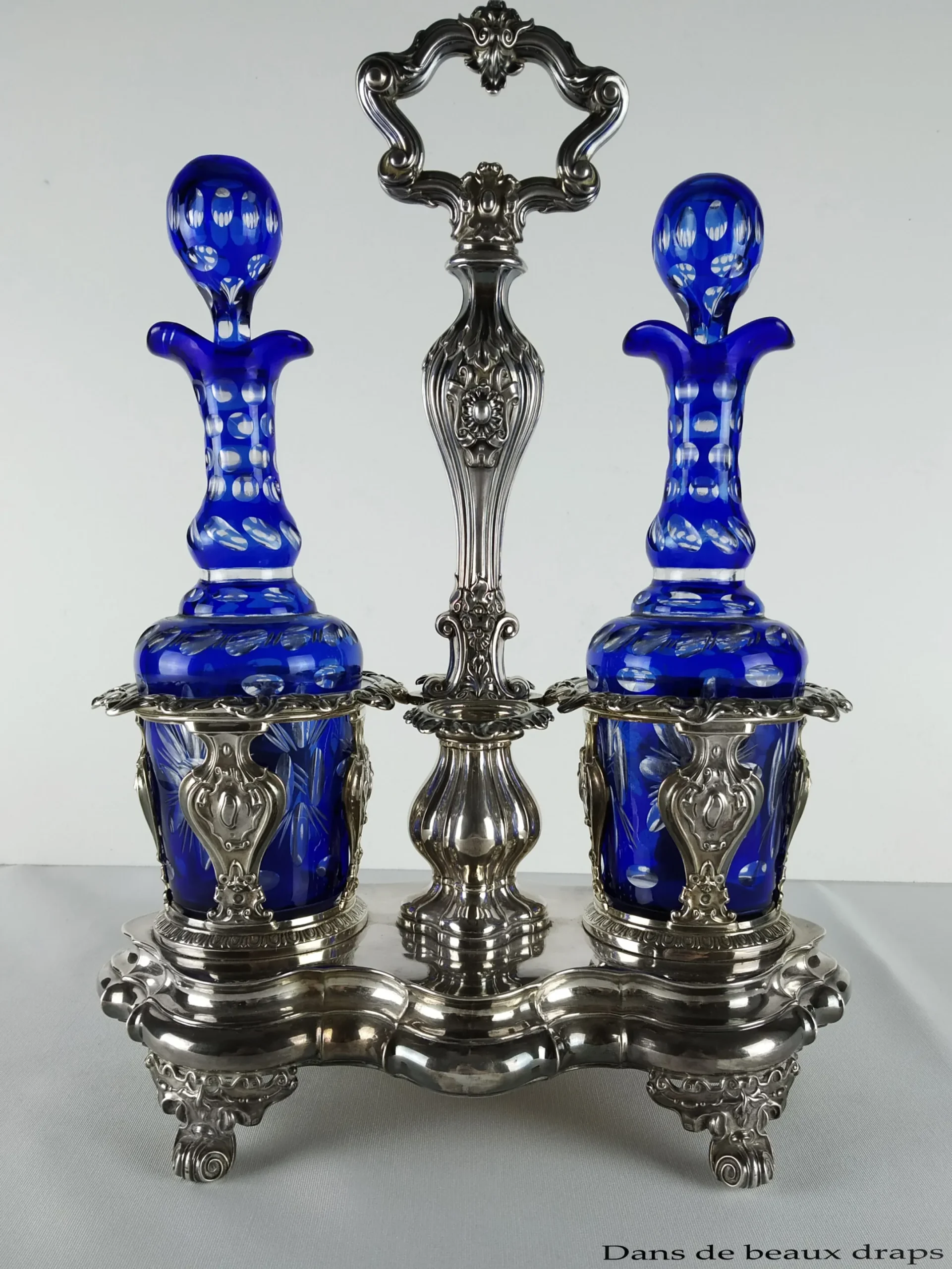 Spectaculaire huilier/vinaigrier en cristal, monture en argent