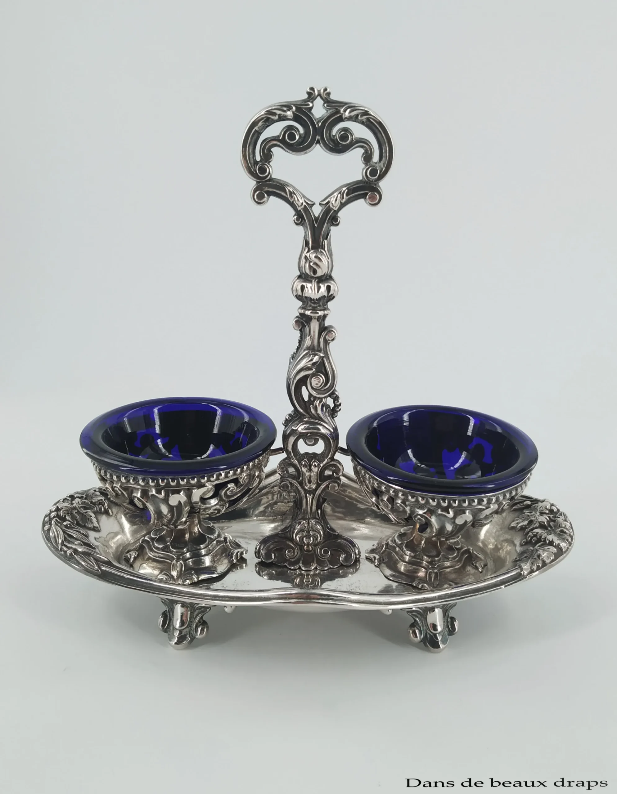 Saleron double en cristal bleu cobalt et argent, XIX ème