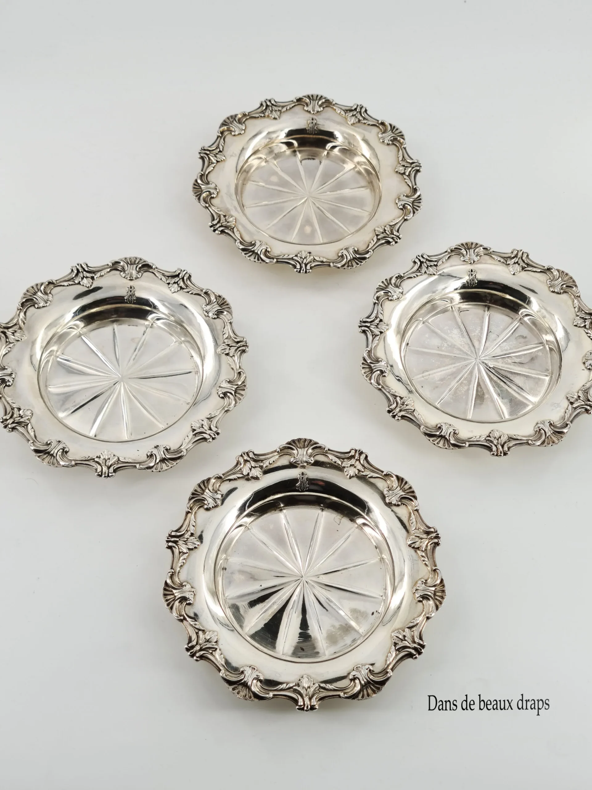 Rare suite de 4 dessous de bouteille ou carafe à galerie en argent massif,orfèvre Alfred Hector, Paris.