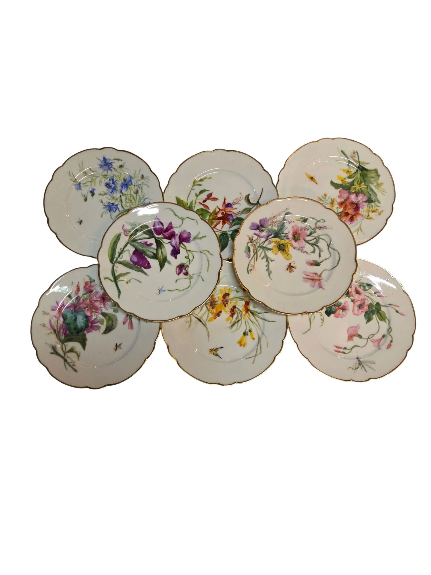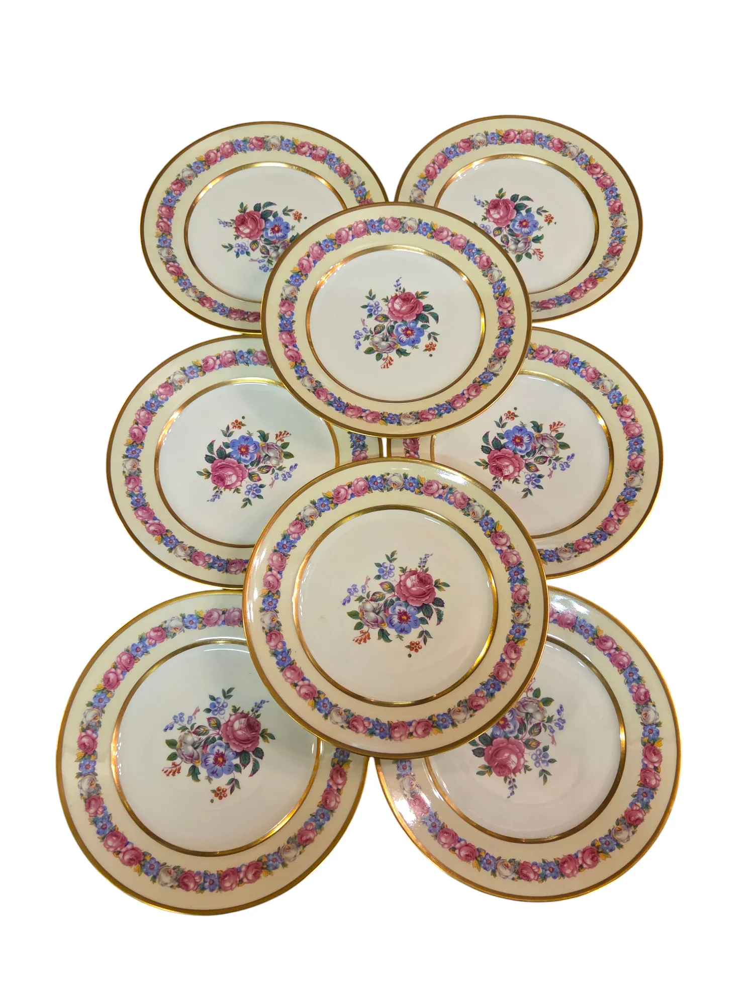 8 assiettes à dessert en porcelaine de Limoges à décor floral, époque Art Déco.