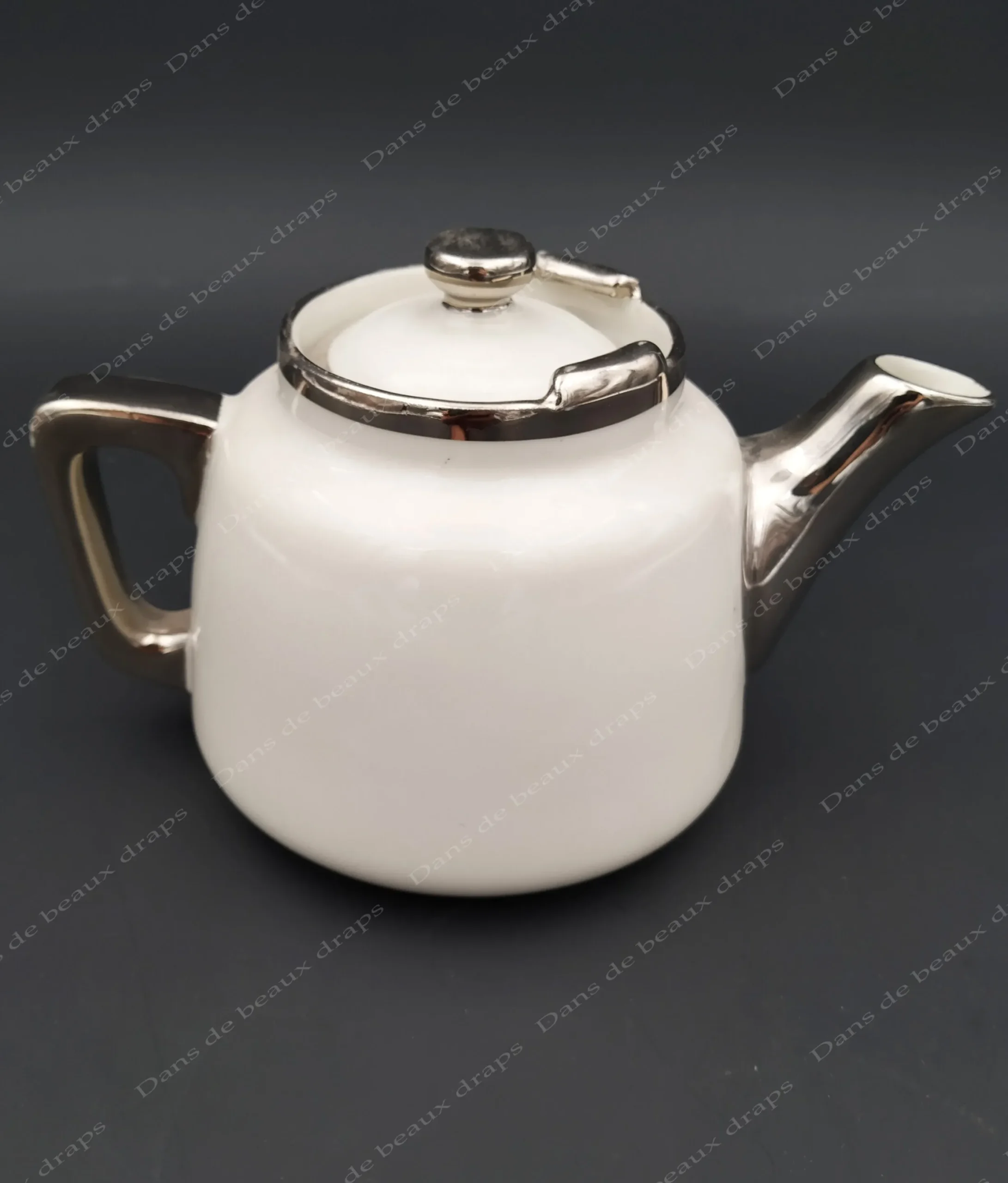 Petite théière blanche et argent en porcelaine de Limoges,aluminite Frugier.