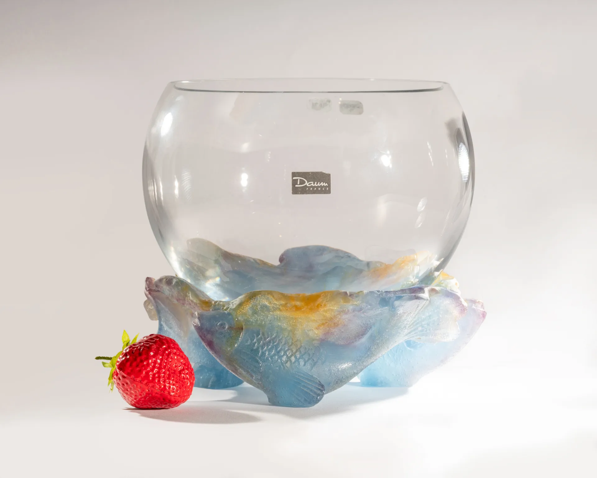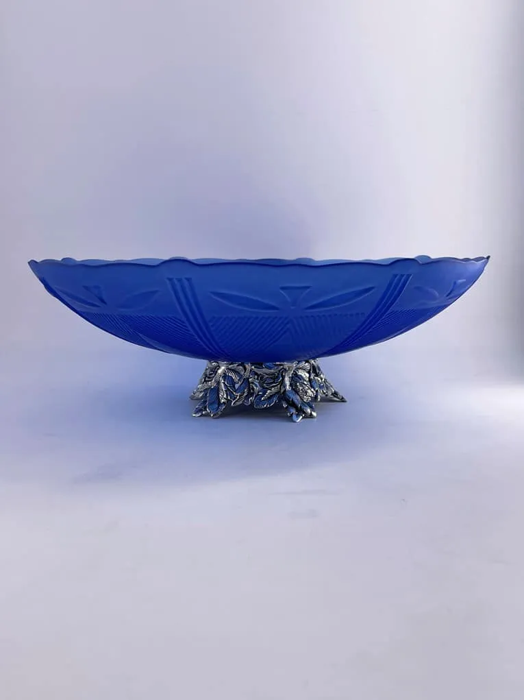 Spectaculaire centre de table en étain et cristal bleu signée Jean Goardère