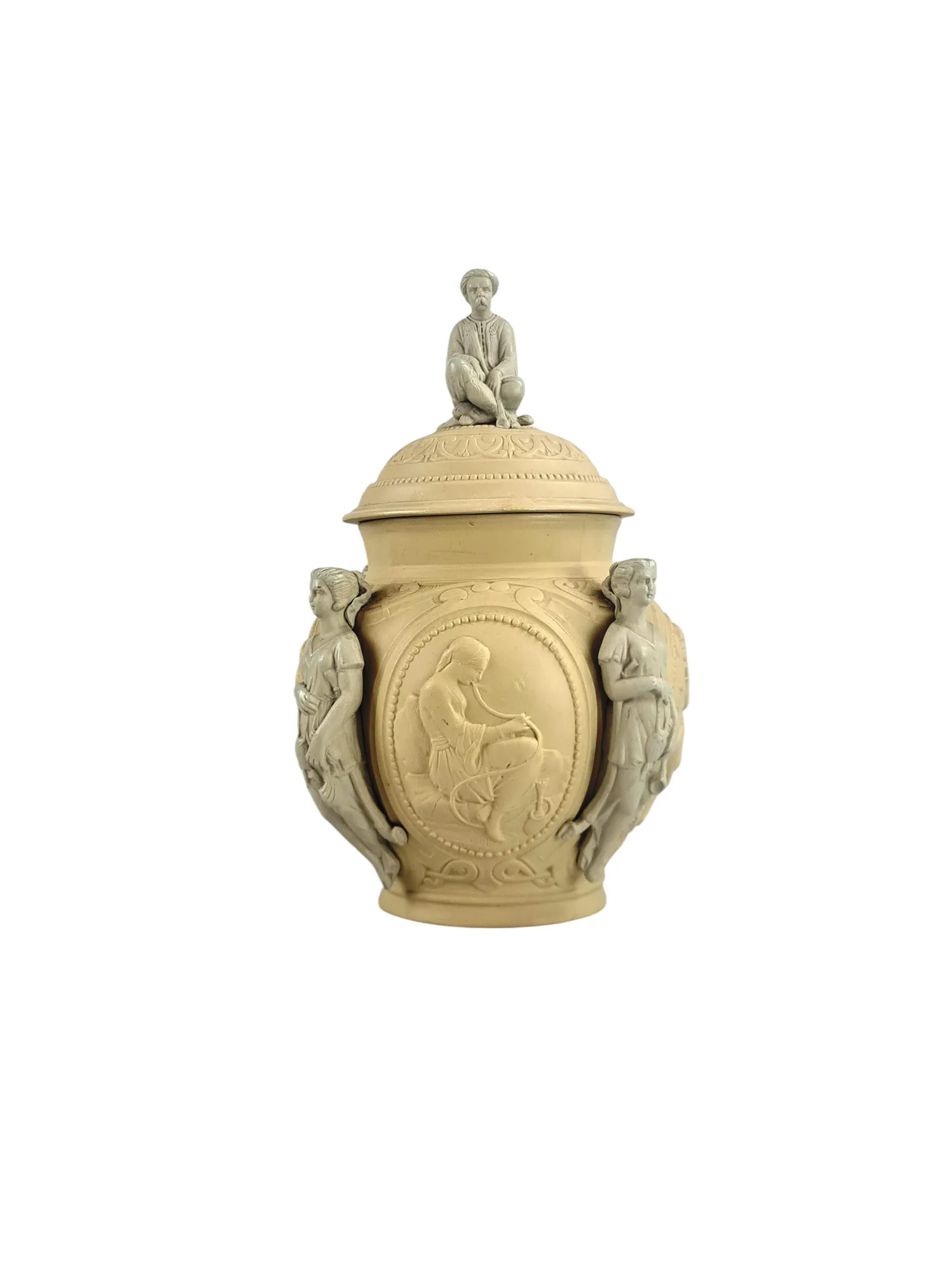 Rare pot à tabac cosmopolite en faïence de Sarreguemines, fin XIXème