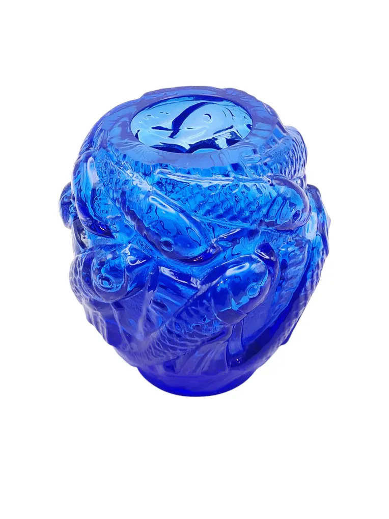 Superbe vase en cristal bleu cobalt à décor de poissons, verrerie de Portieux