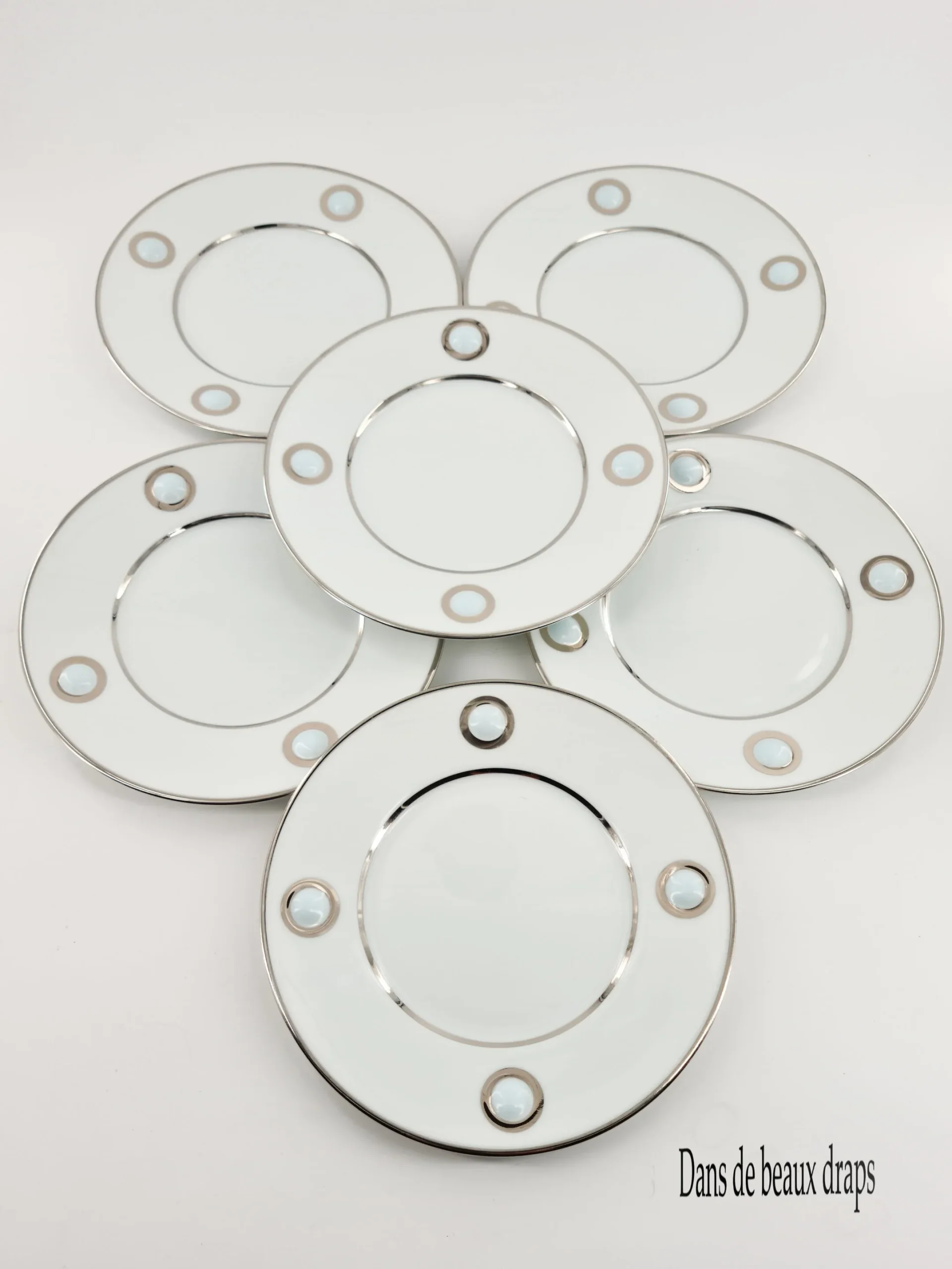 Magnifique suite de 6 assiettes à dessert en porcelaine de Limoges, maison Bernardaud, modèle Ithaque Platine