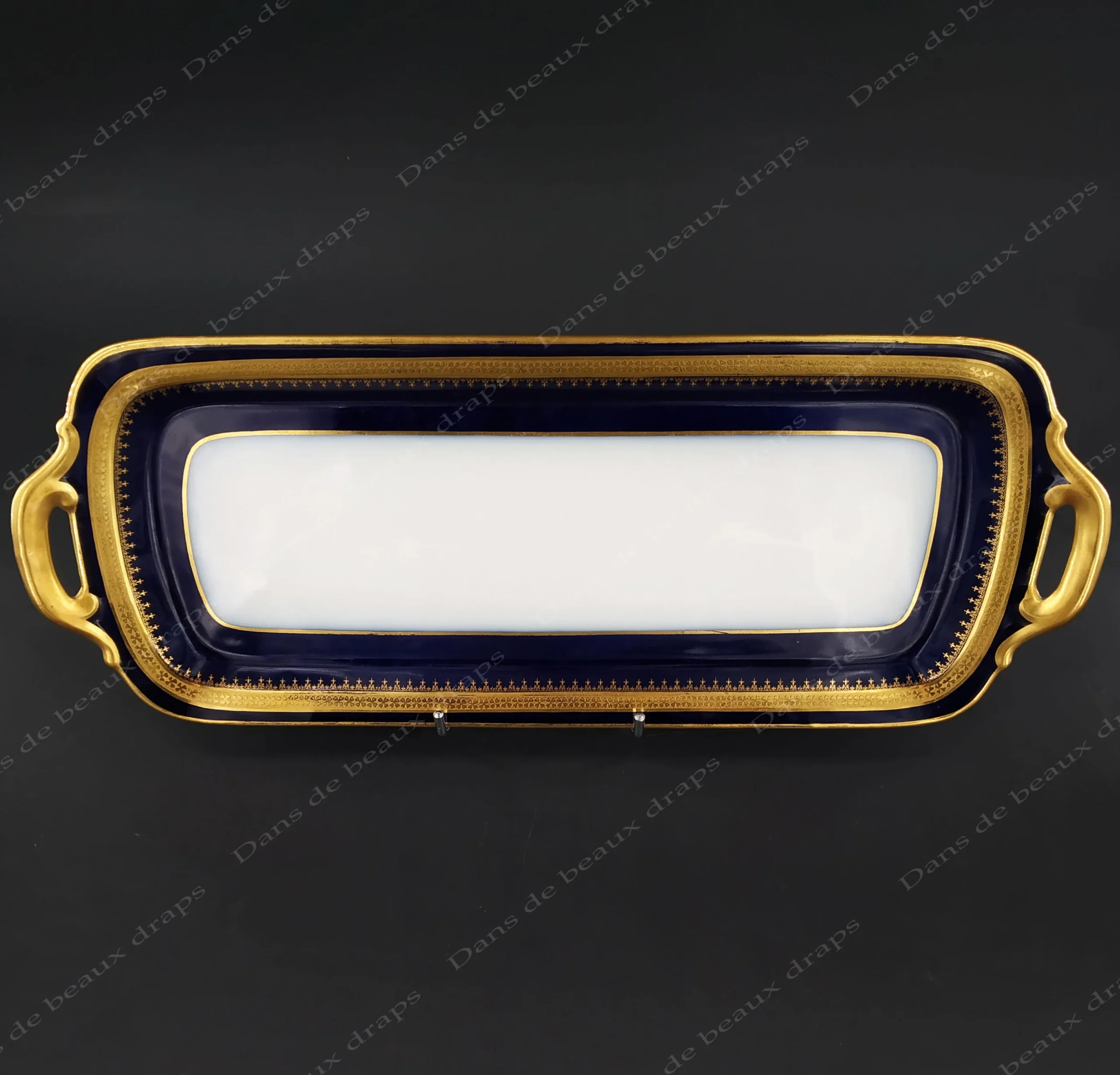 Plat à cake en porcelaine de Limoges,bleu de four et or.