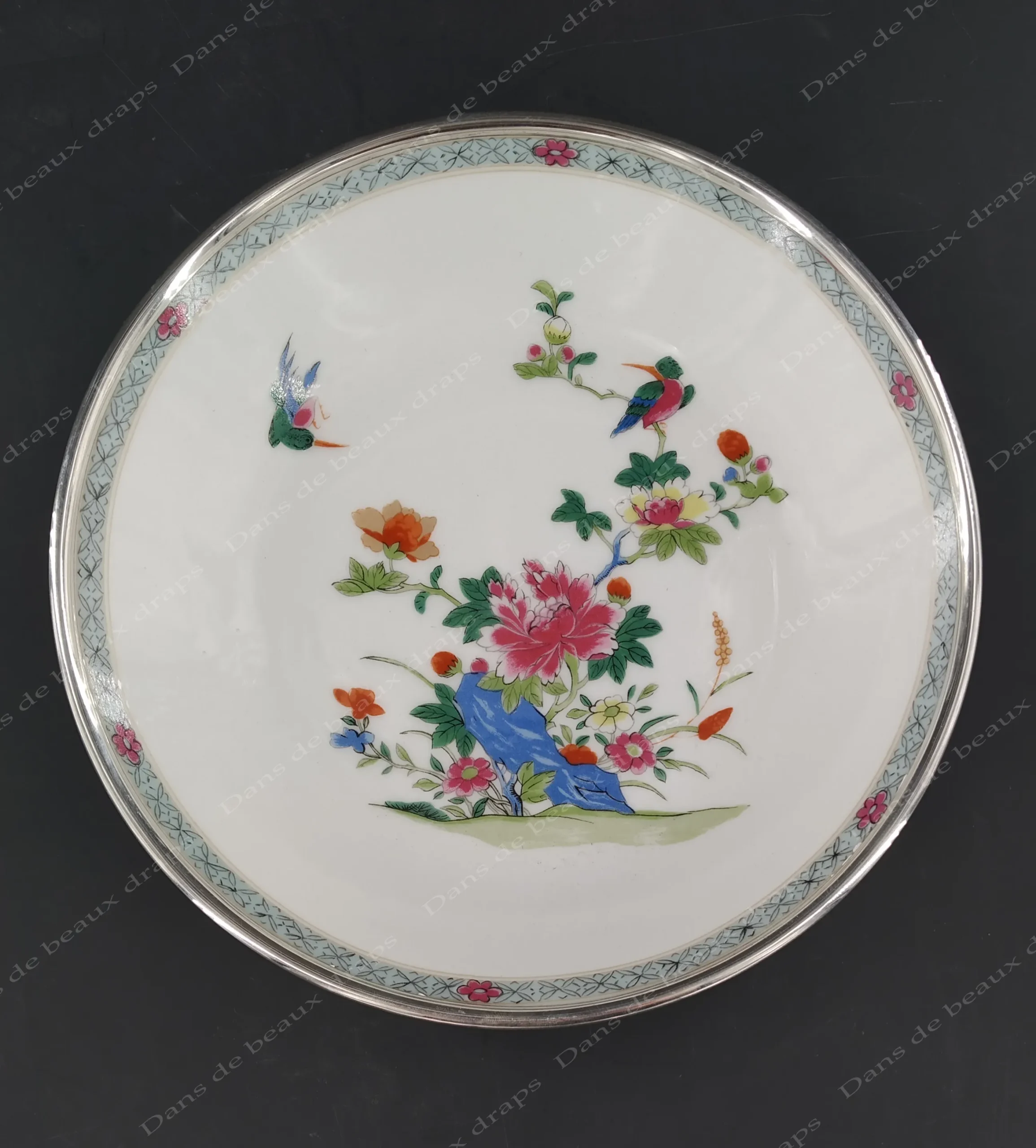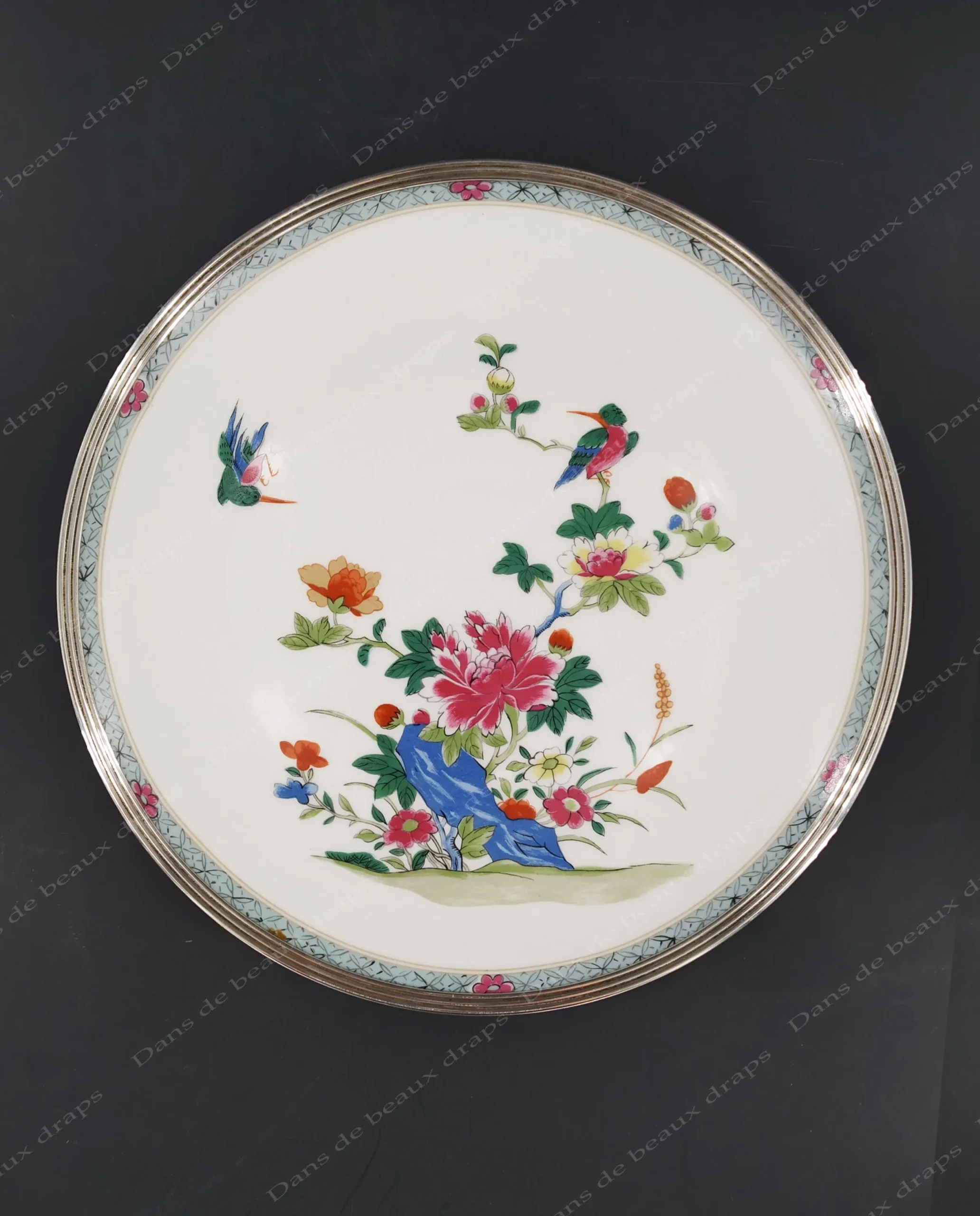 Très joli plat rond en porcelaine de Limoges et argent, maison Raynaud,orfèvre Puiforcat.
