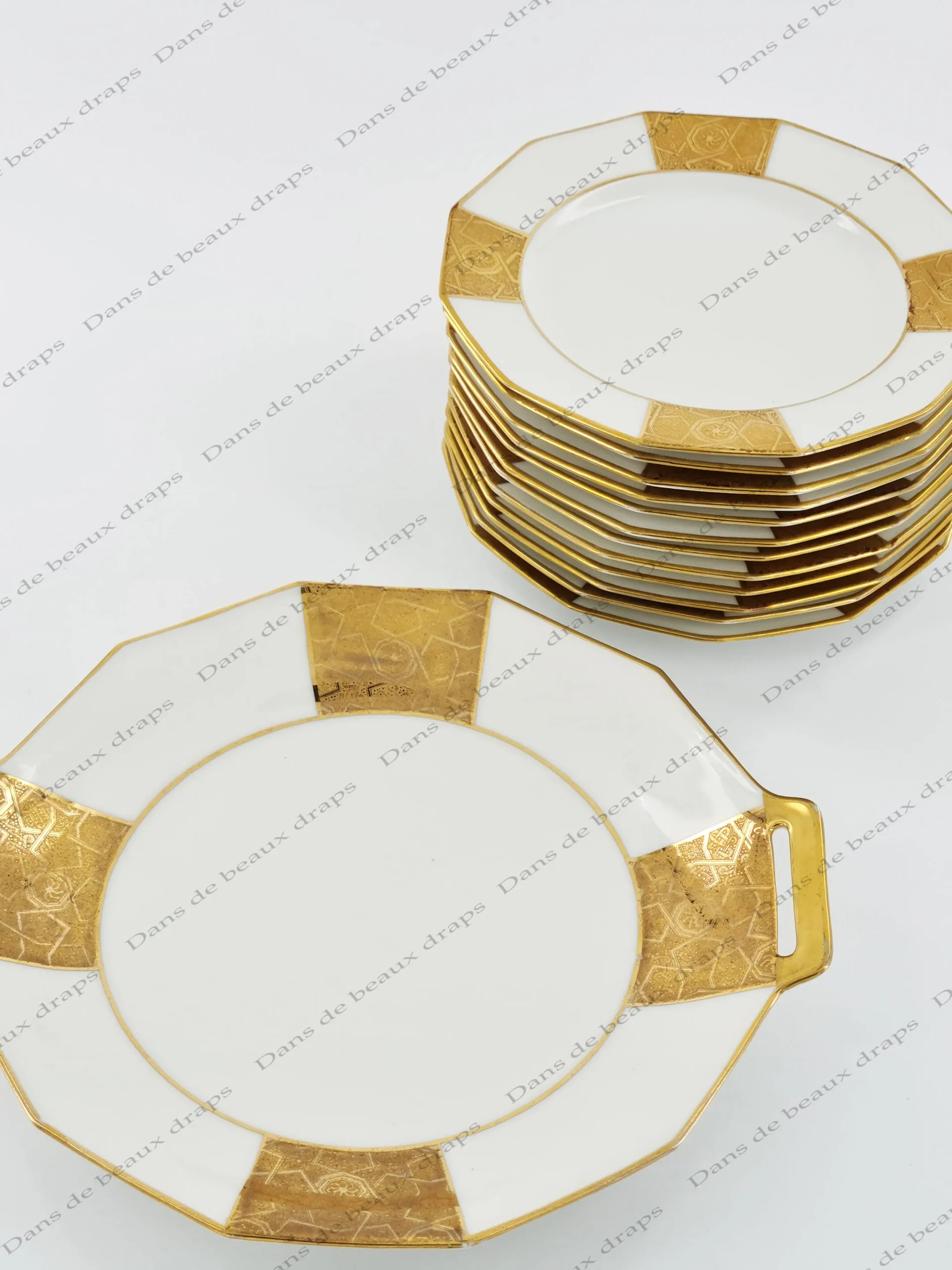 Suite de 12 assiettes à dessert en porcelaine de Limoges, époque Art Déco
