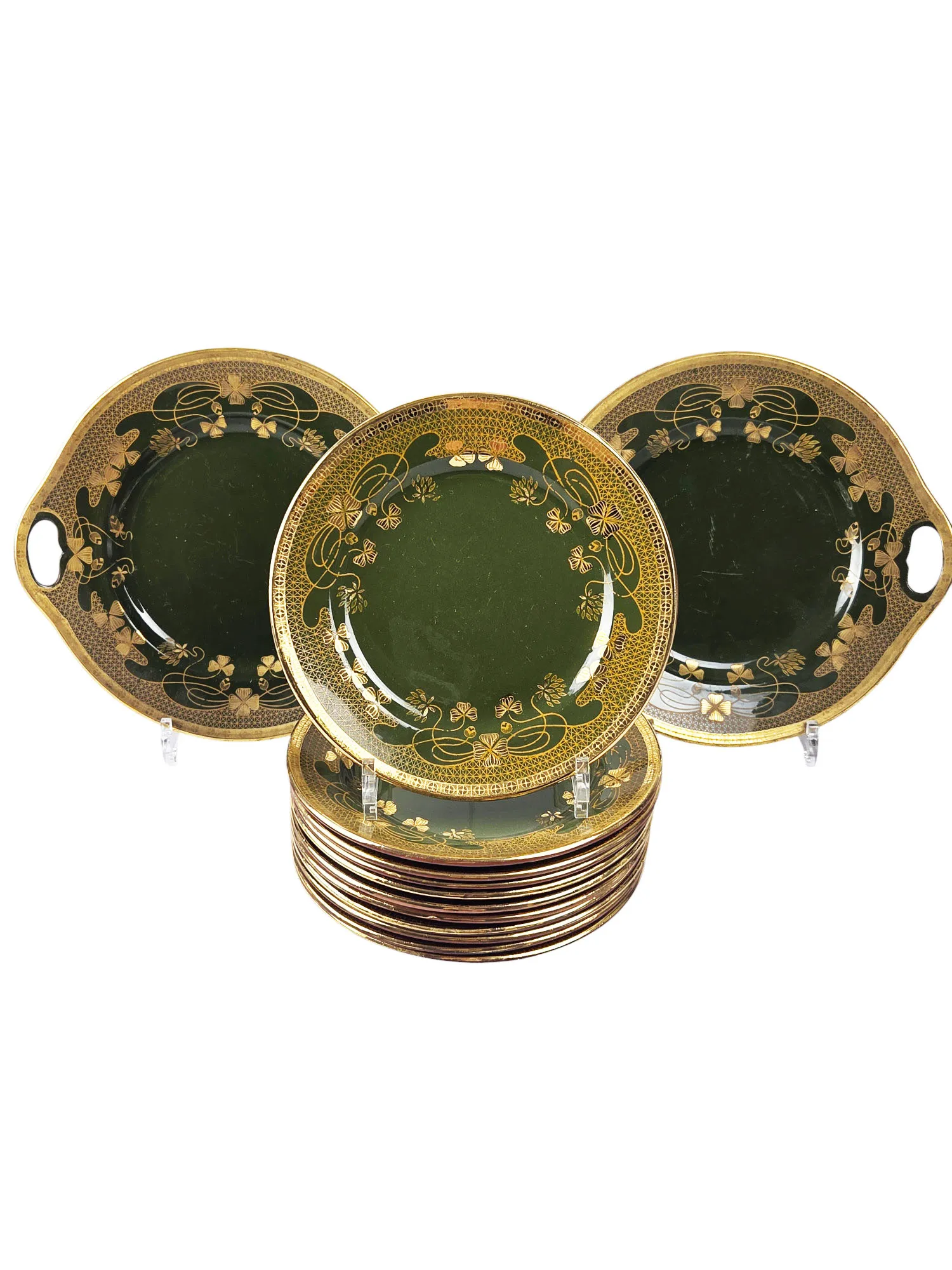 Rare service à dessert en grès verni de Sarreguemines, époque Art Nouveau, 13 pièces