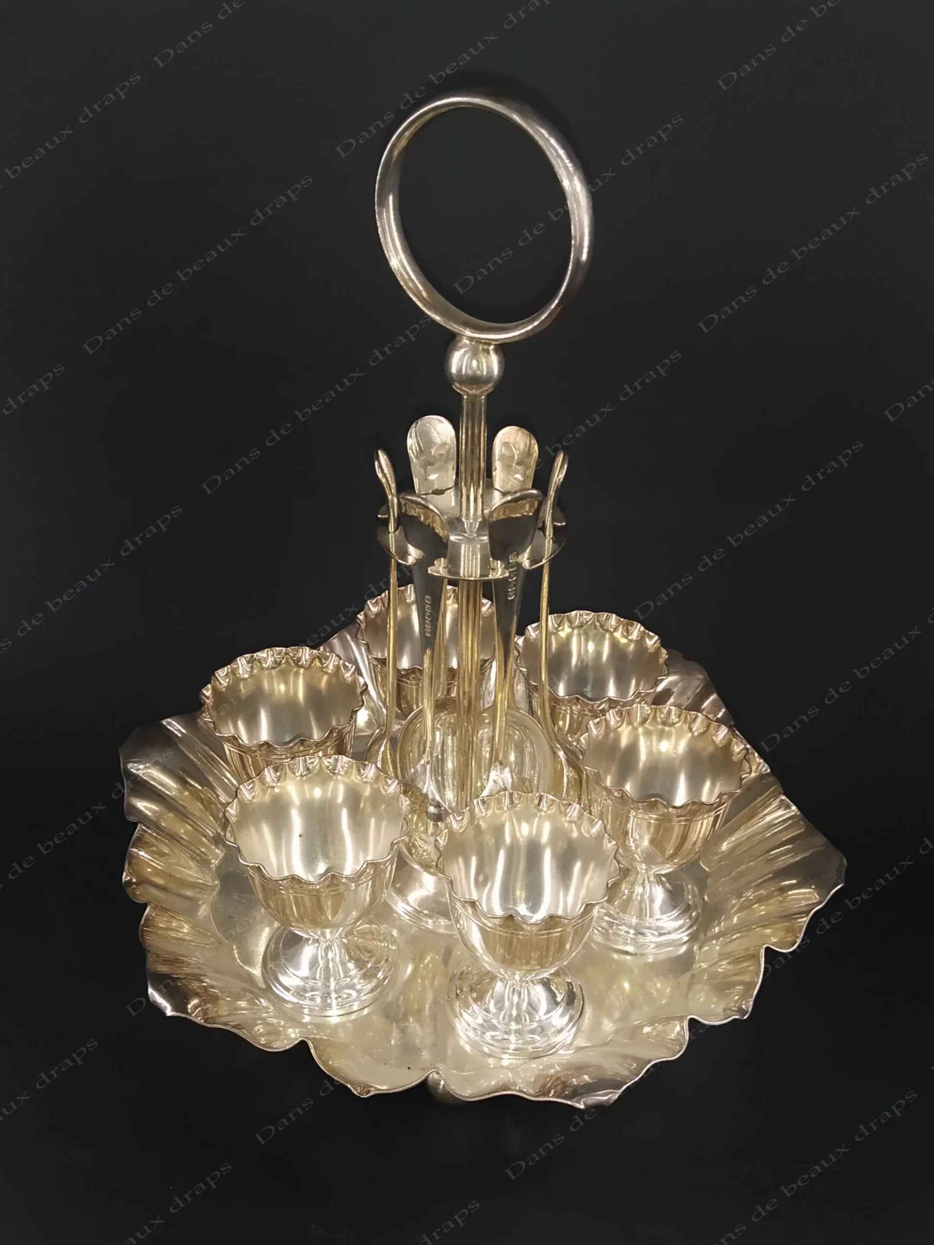 Présentoir à œufs en métal argenté et ses cuillères ,Angleterre.