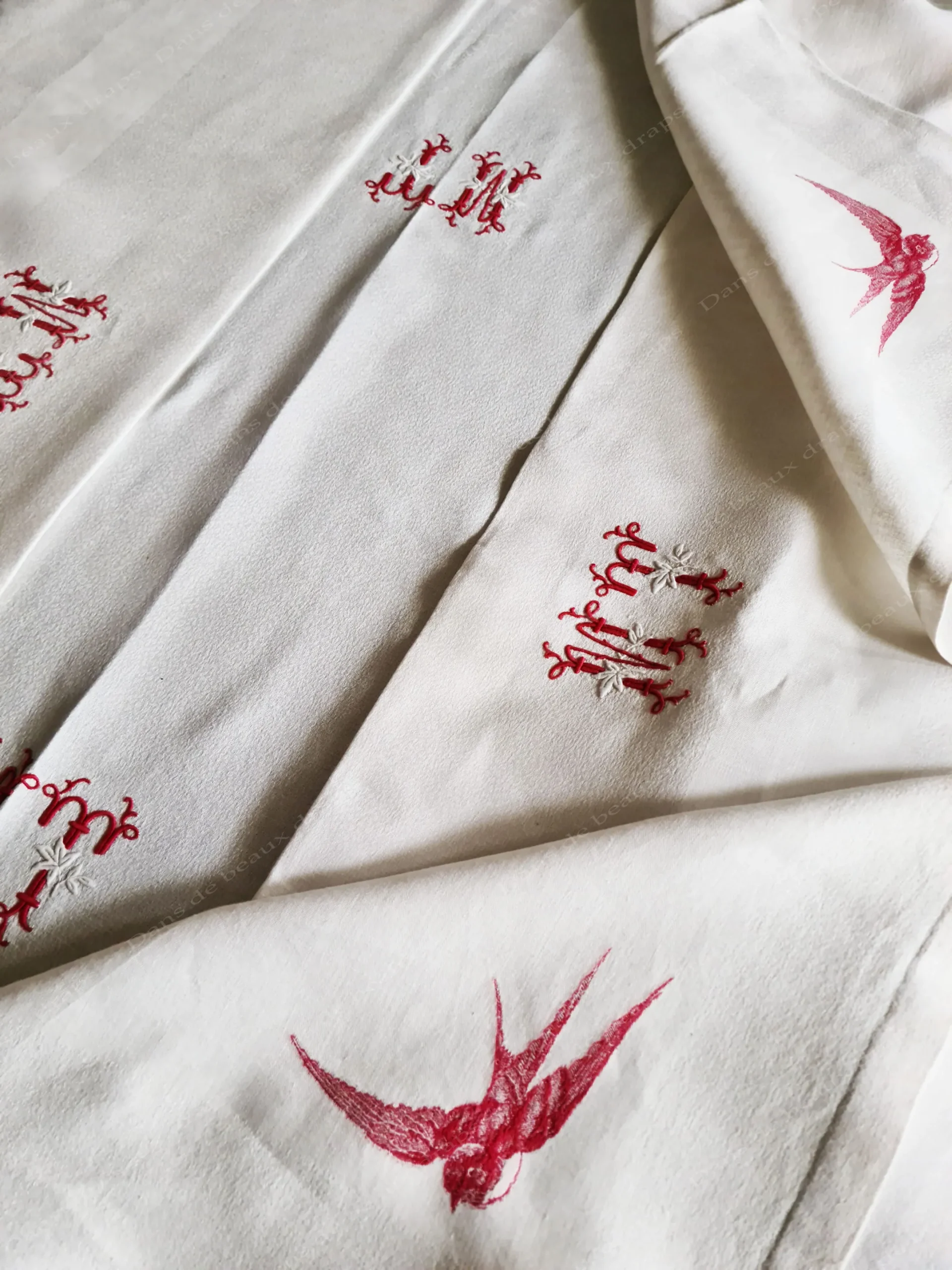 Superbe service de table en damassé de lin à décor floral monogrammé RV.