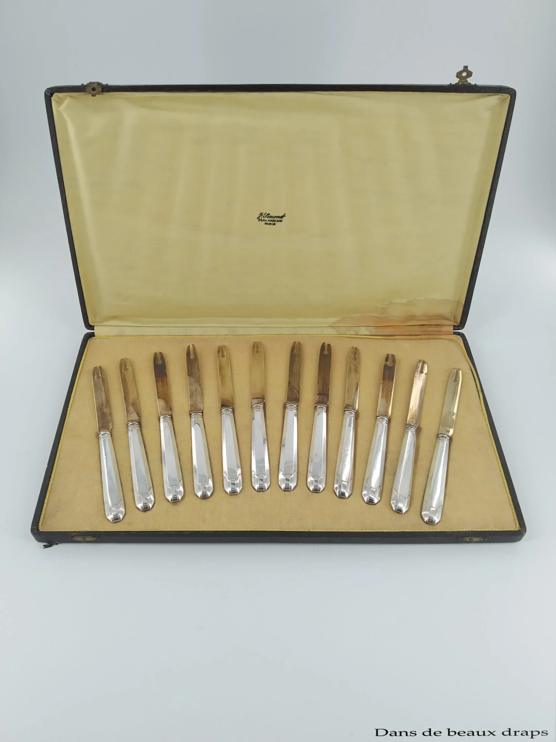 Suite de 12 fourchettes en argent massif, lames en métal doré, époque art déco