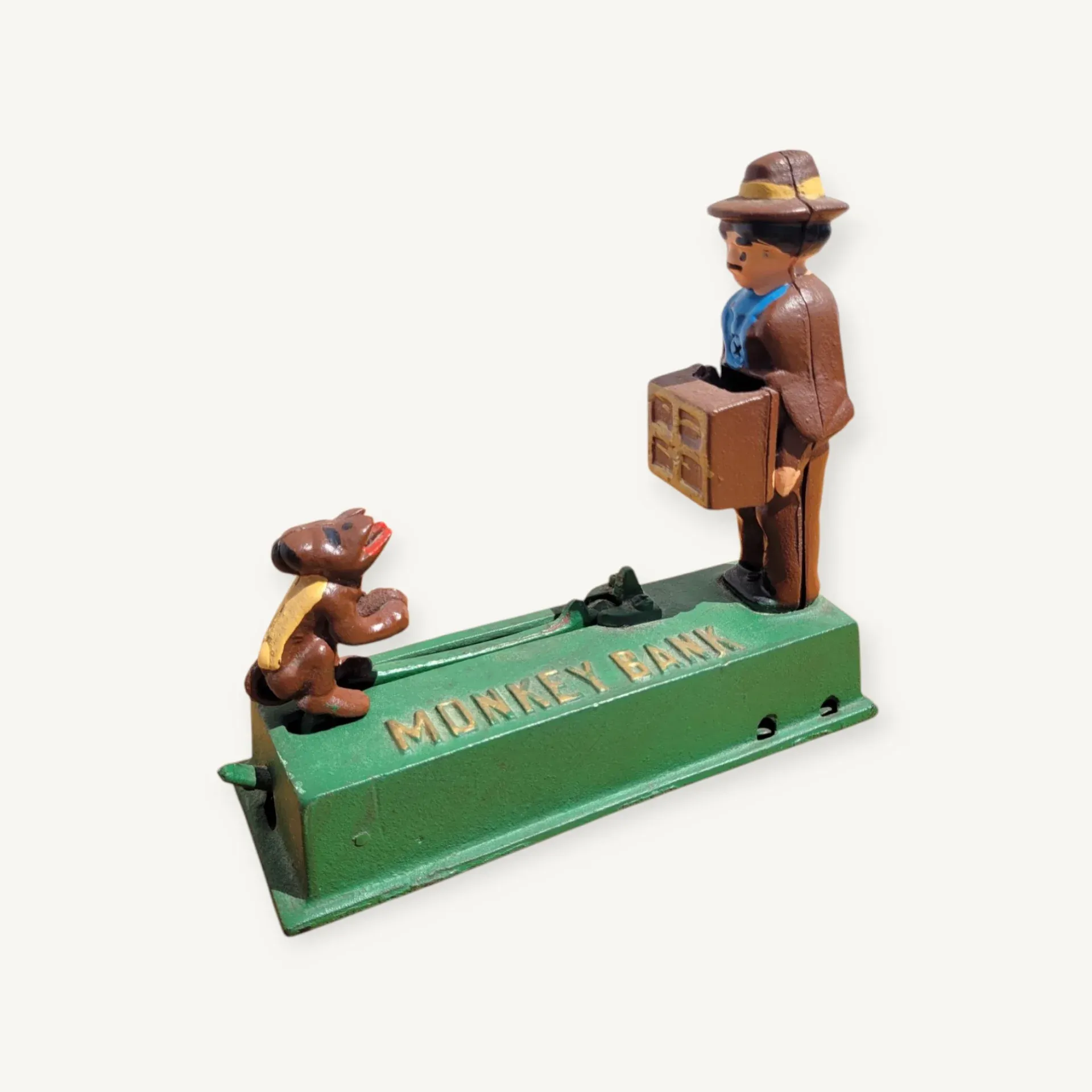 Tirelire à mécanisme ancienne Monkey Bank en fonte