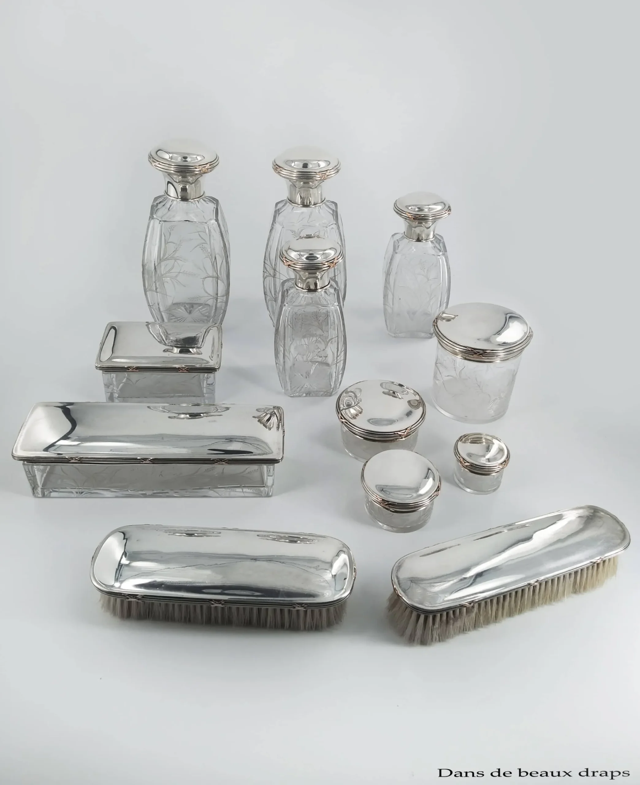 Exceptionnelle garniture de toilette en cristal gravé et argent, époque art nouveau,9 pièces