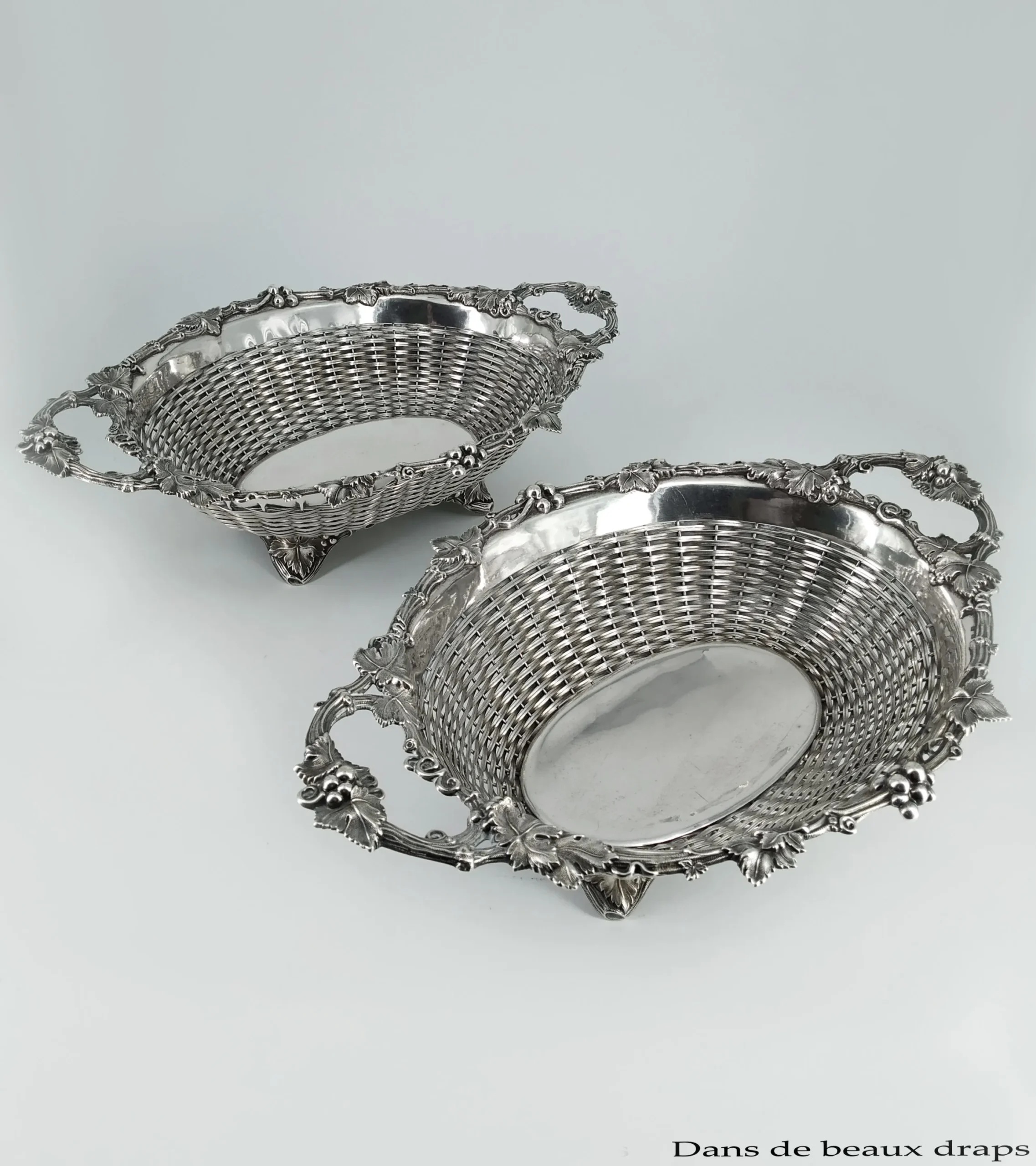 Rare paire de panières en argent , à décor de grappes de raisin et pampres de vigne, milieu du XIX ème