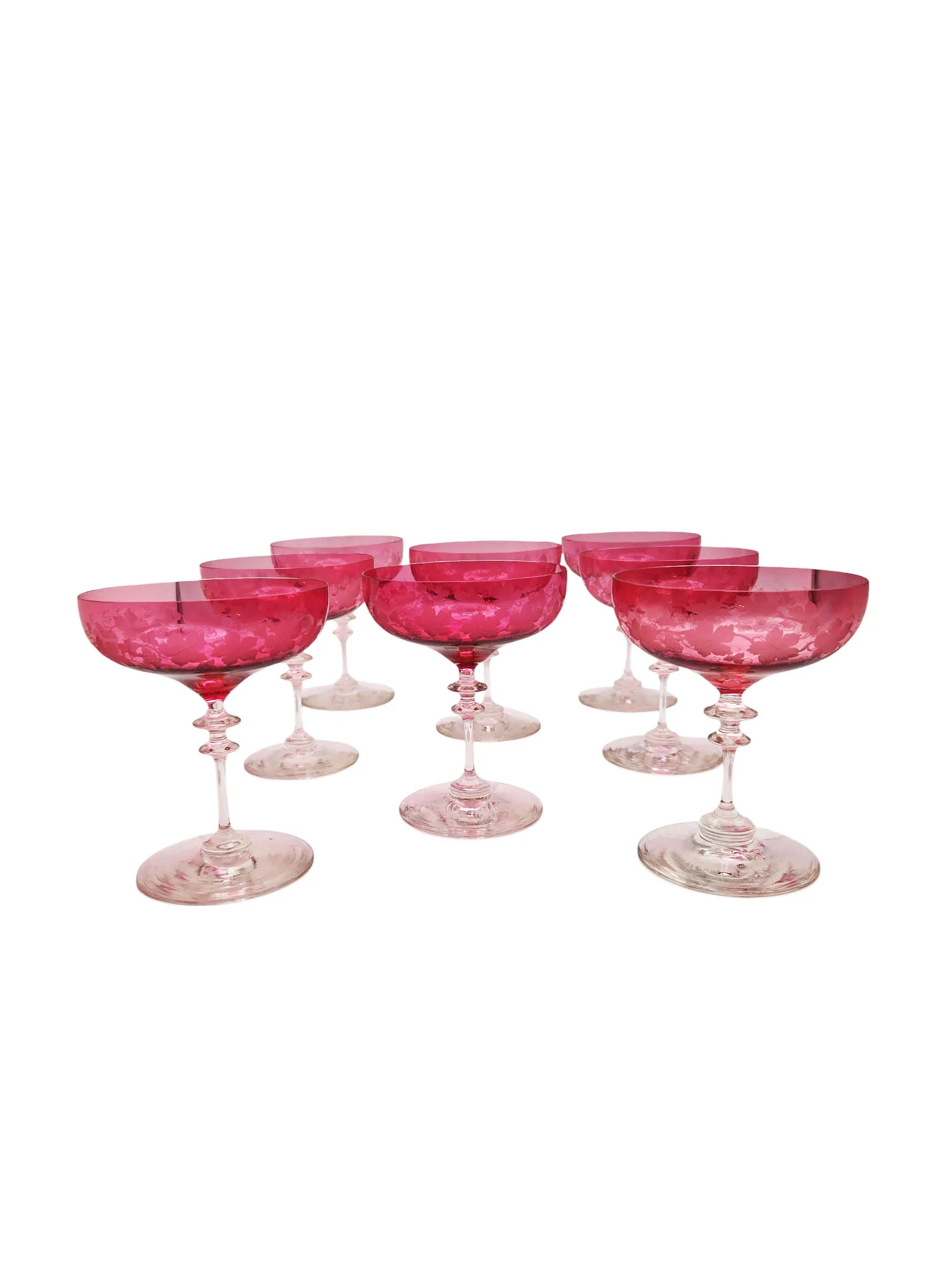 Très rare suite de 8 coupes à champagne en cristal doublé rose et gravé, XIXème.