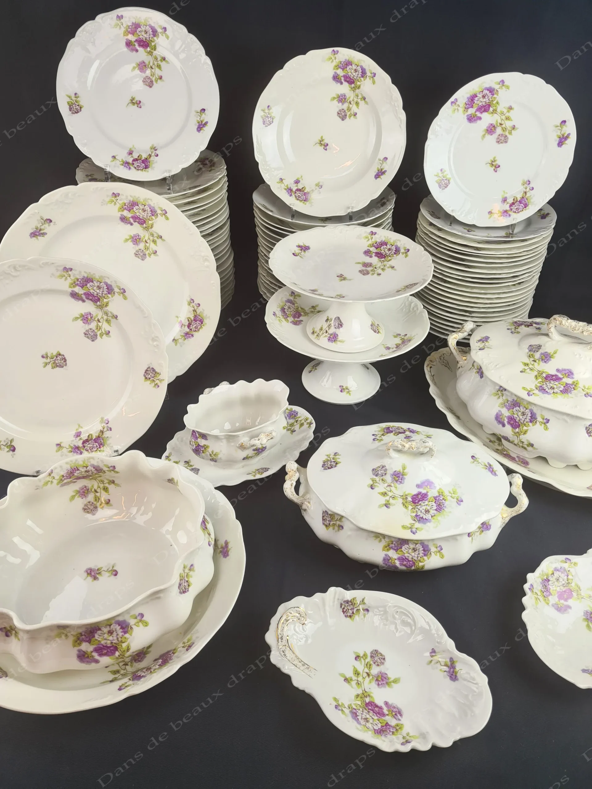 Partie de service de table en porcelaine de Limoges à décor de fleurs mauves,époque art nouveau, 83 pièces.