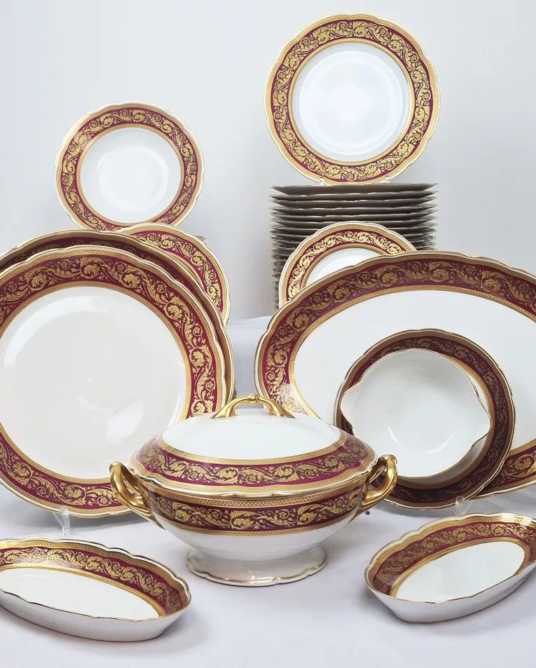 Splendide service en porcelaine de Limoges maison Bernardaud modèle Vendôme décor sur fond rouge magenta,double frise et rinceaux dorés, 66 pièces.