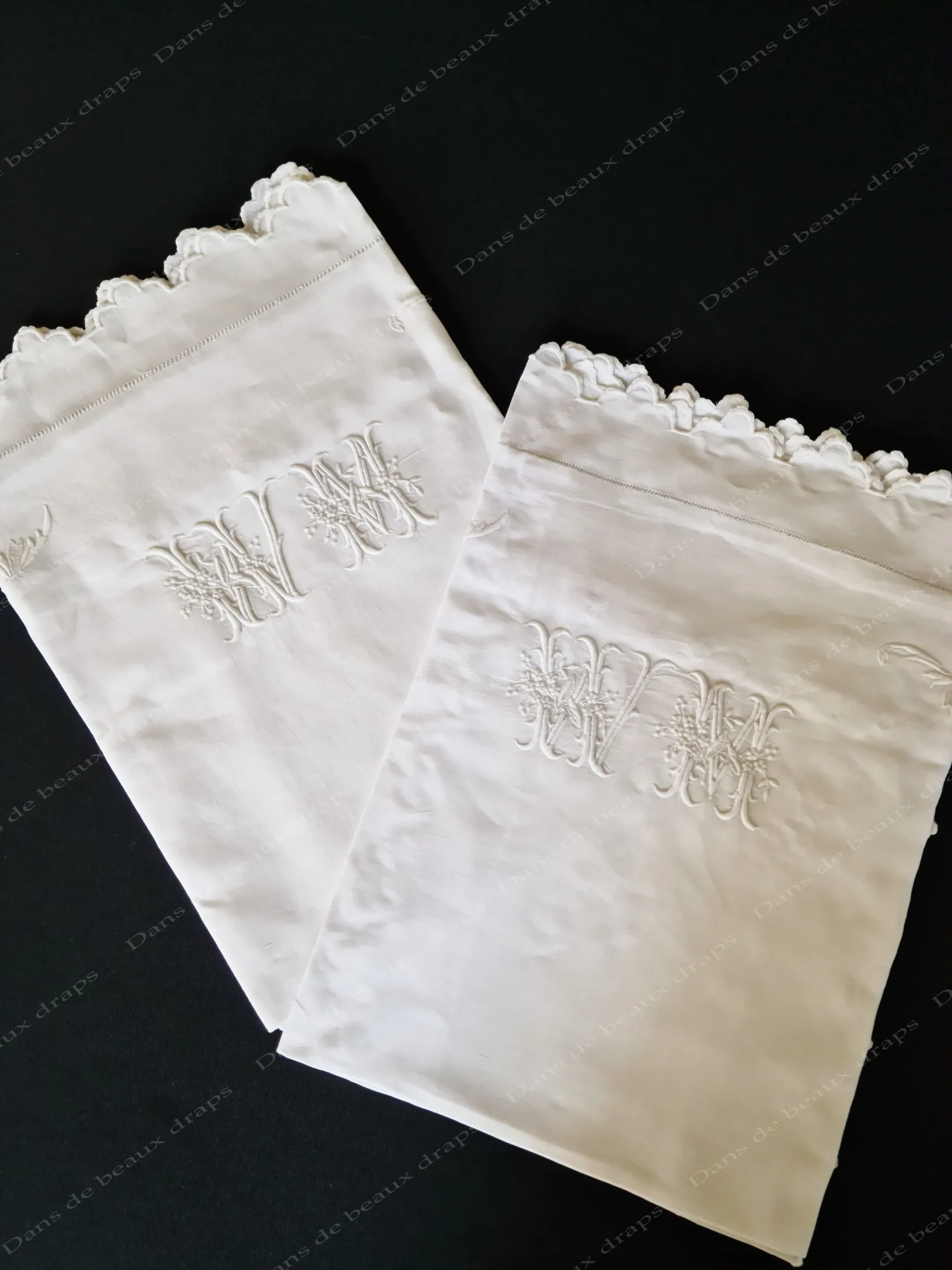Magnifique paire de taies d’oreiller en fil de lin brodées et monogrammées WM.