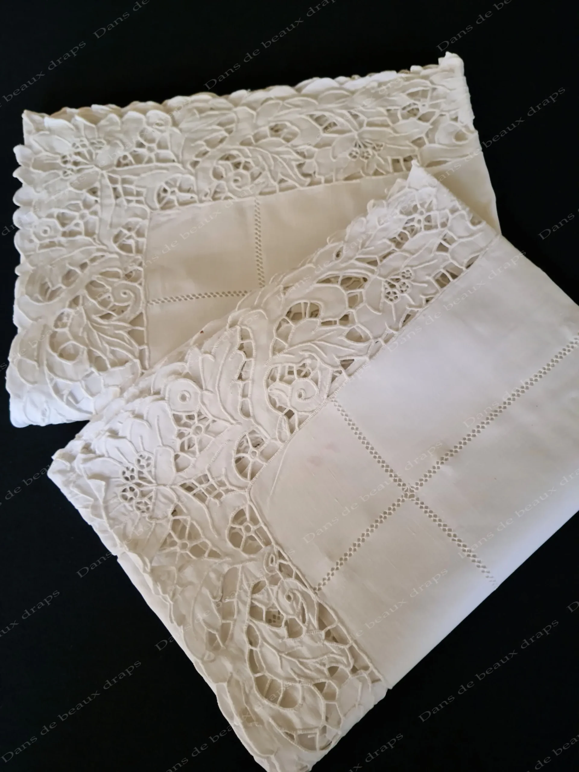 Ravissante paire de taies d’oreiller en fil de lin sans monogramme,broderies Richelieu.