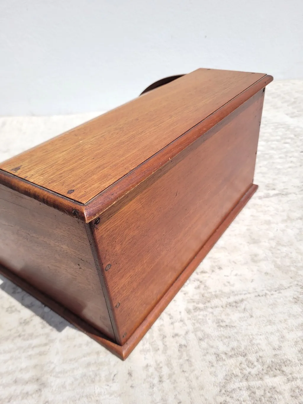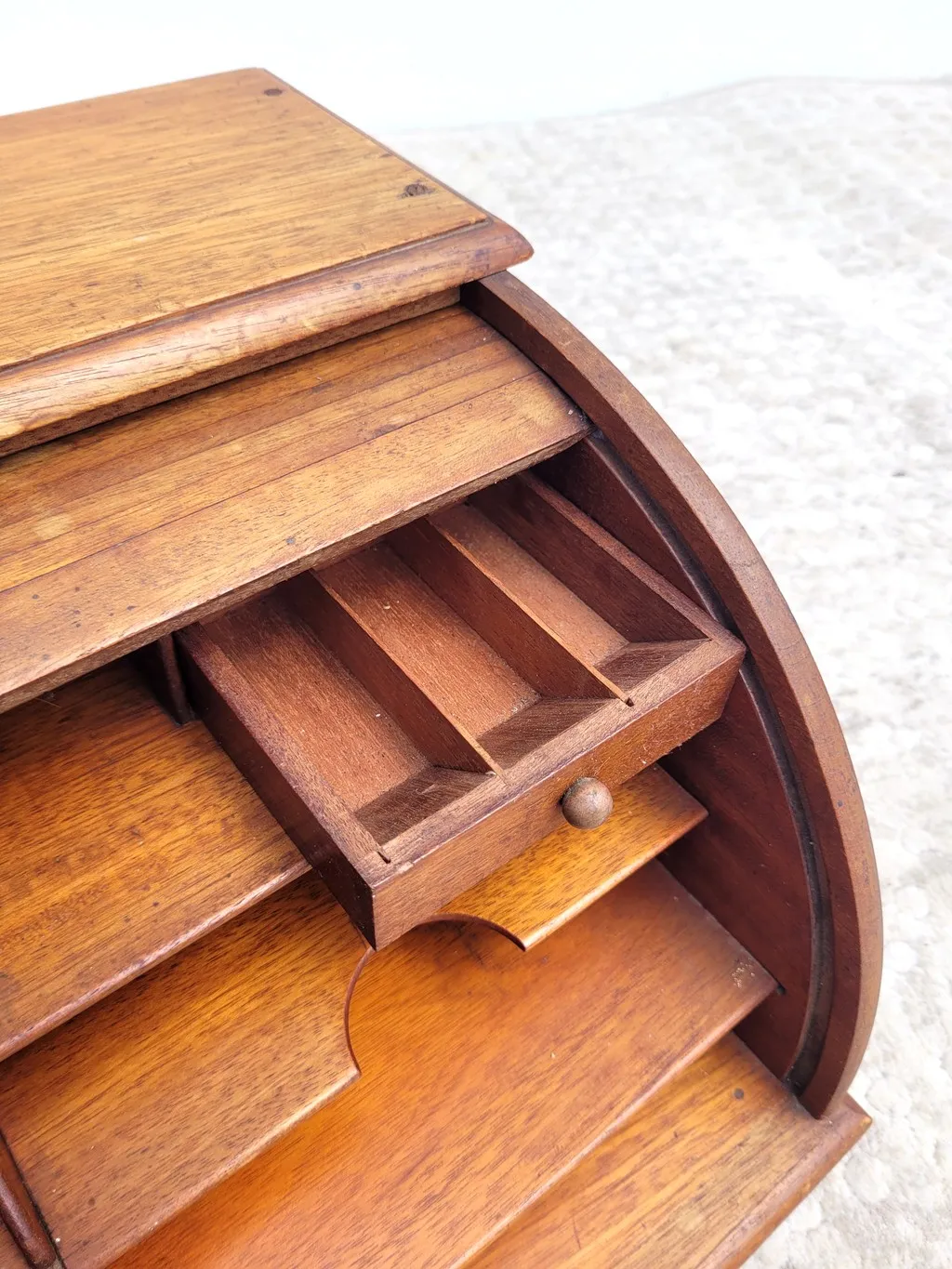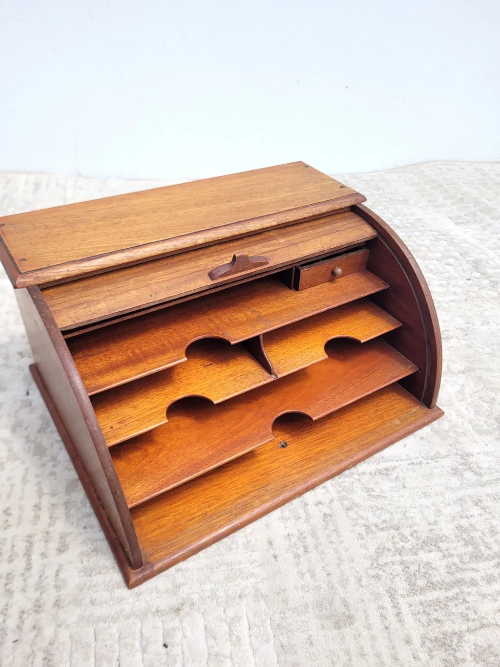 À l’intérieur plusieurs étages pour les papiers, les lettres, les enveloppes, et un petit tiroir pour les timbres.
