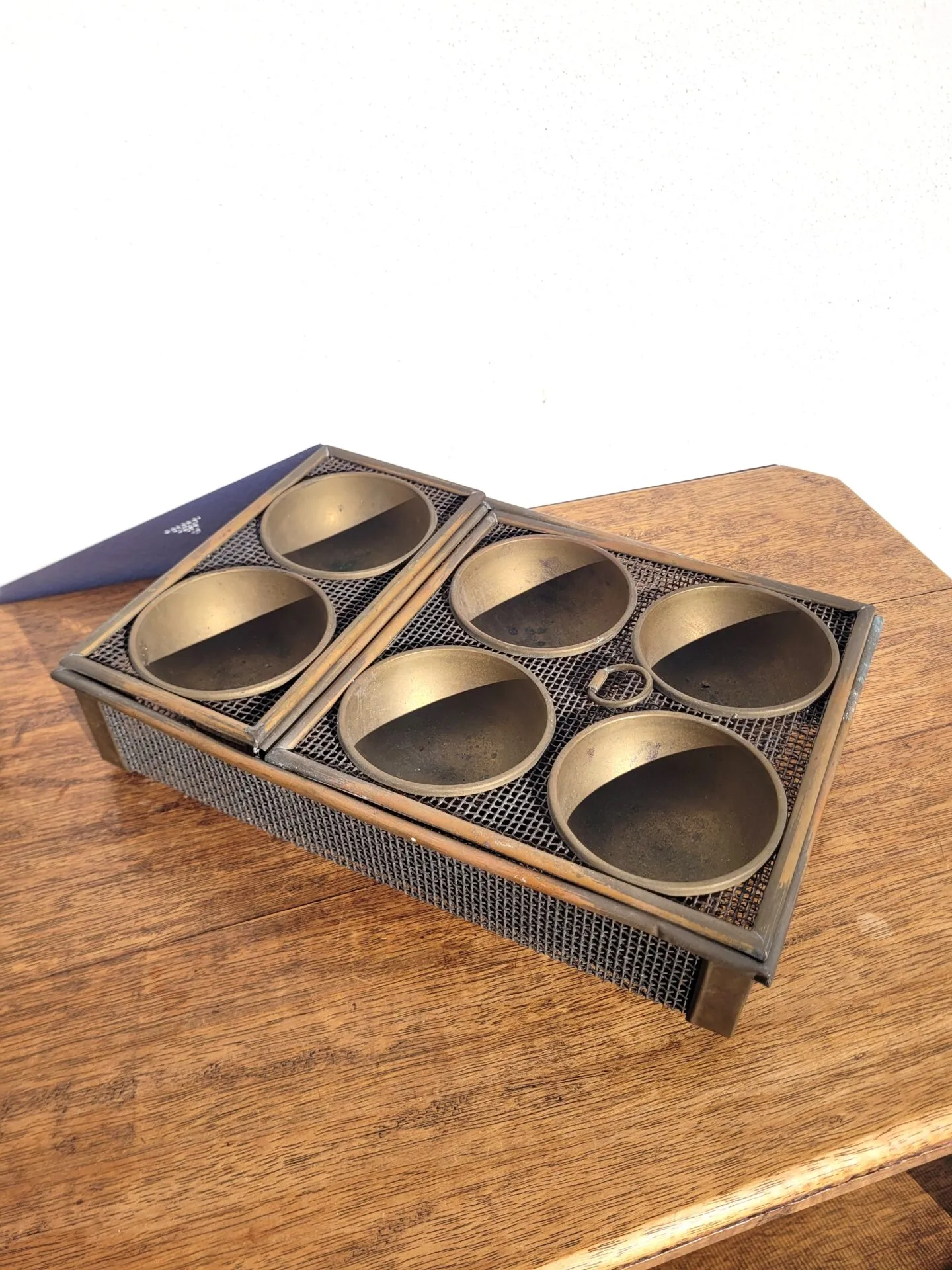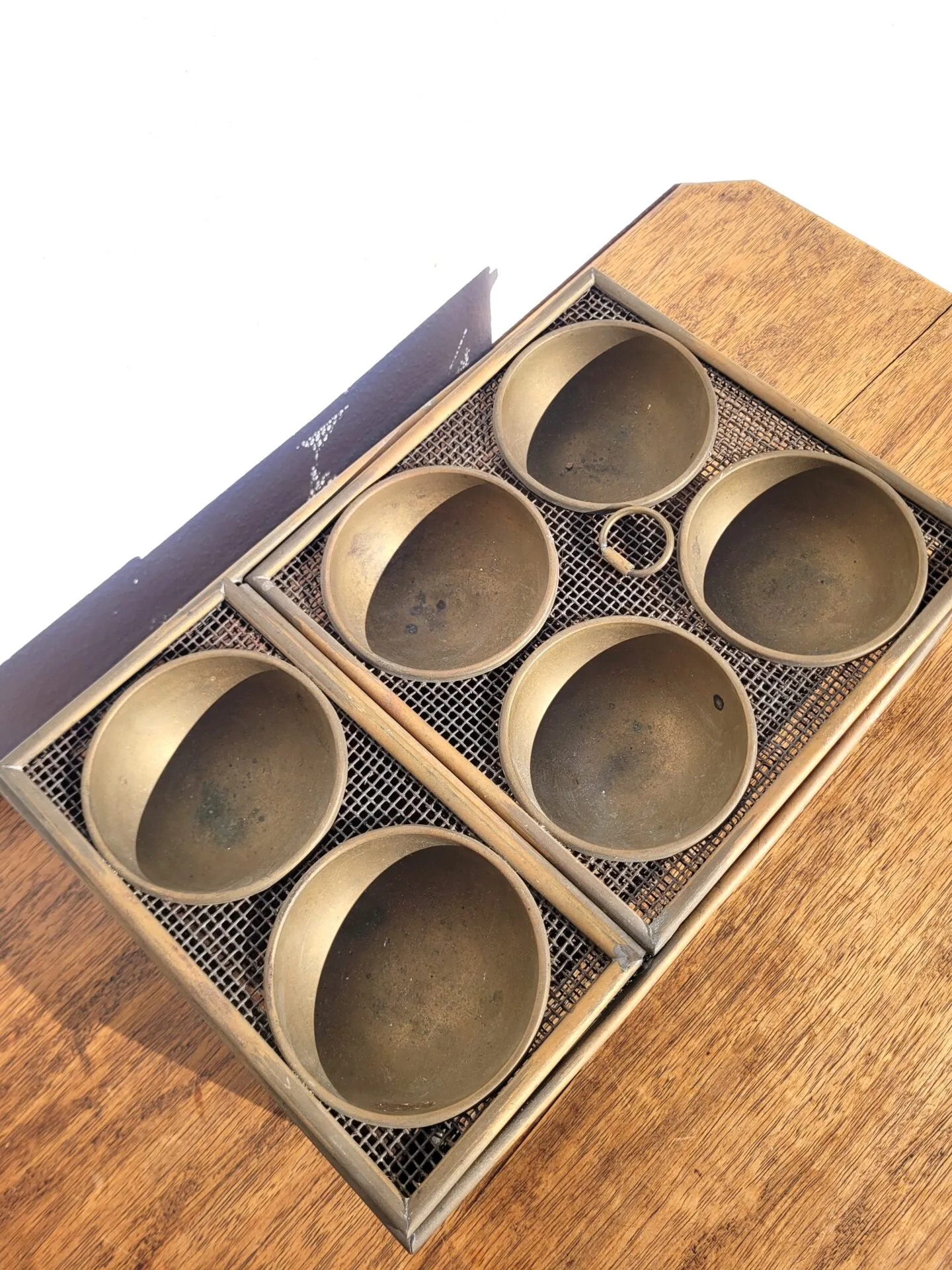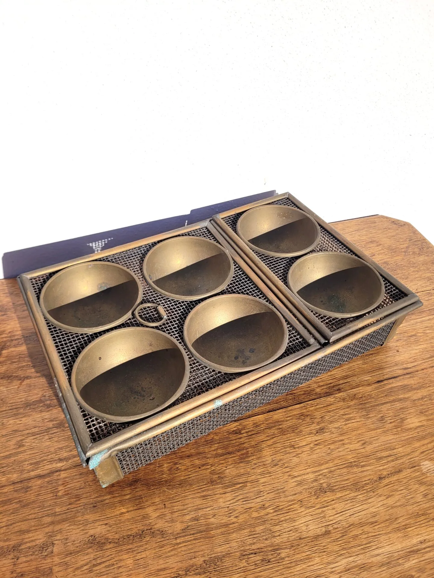 État d’origine (les soudures de la paroi du milieu ont lâchées sans que ce soit très gênant..) l’objet peut être nettoyé pour retrouver une teinte plus doré plutôt que cette patine