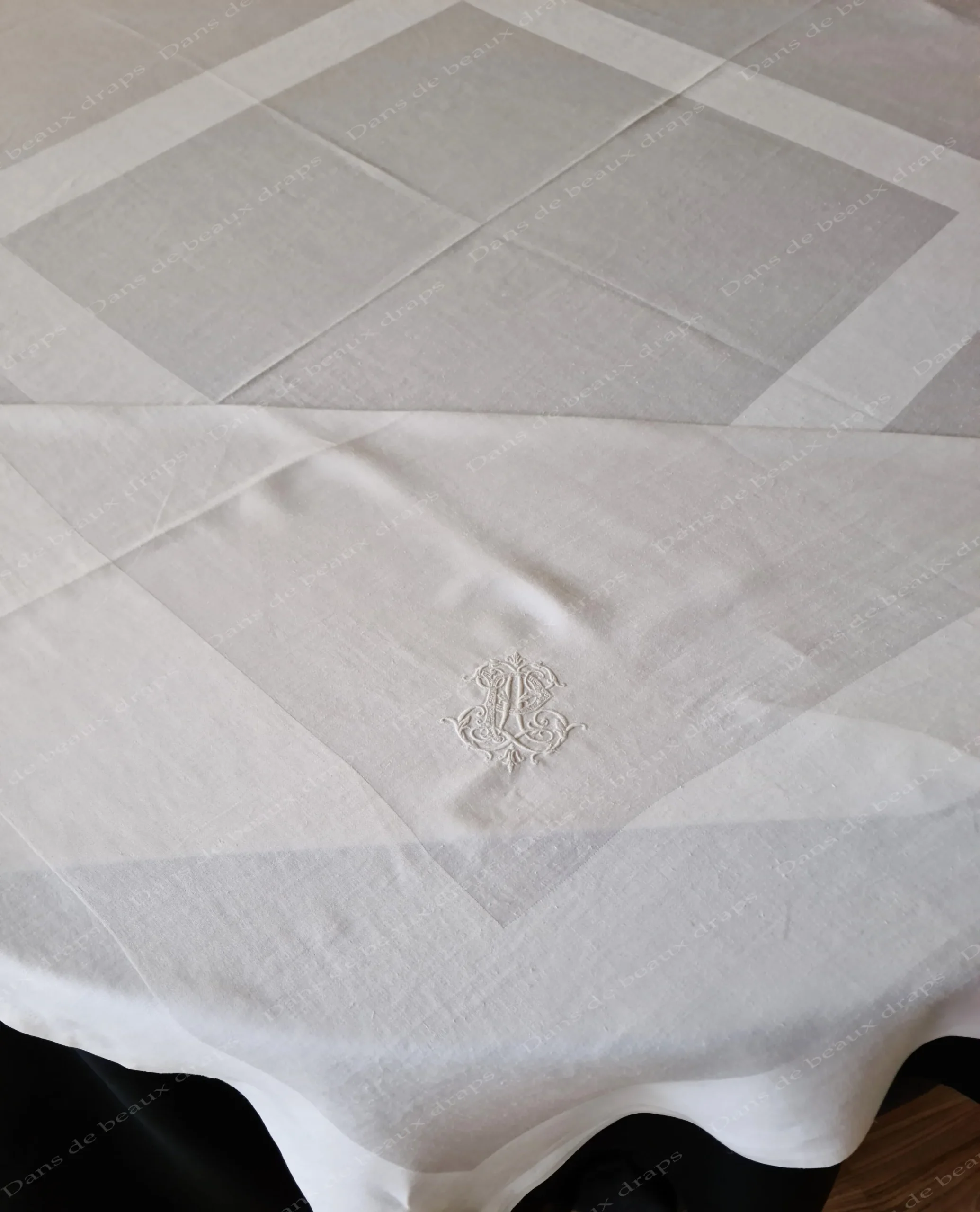 Belle nappe carrée en damassé de lin,monogramme LP.