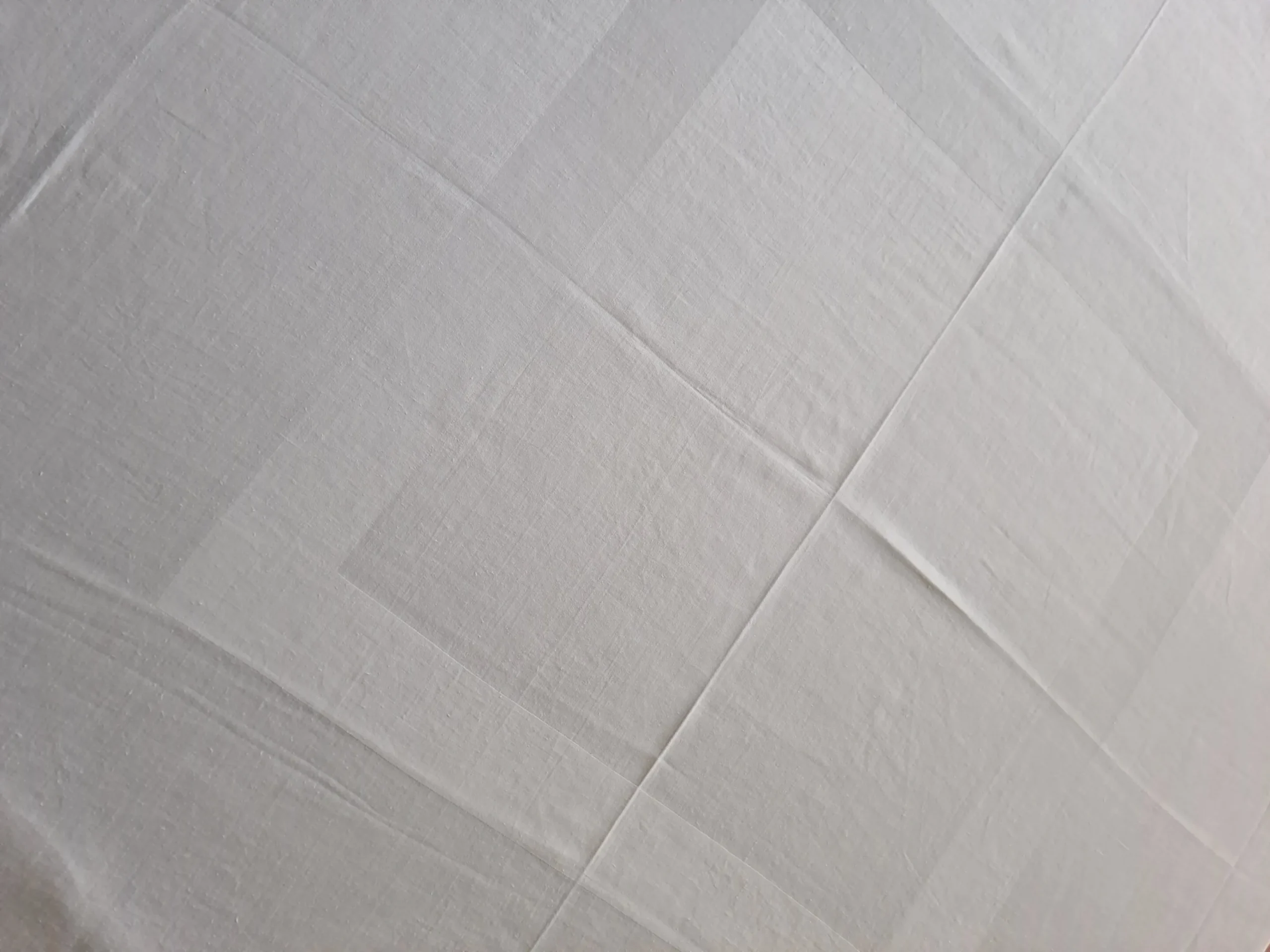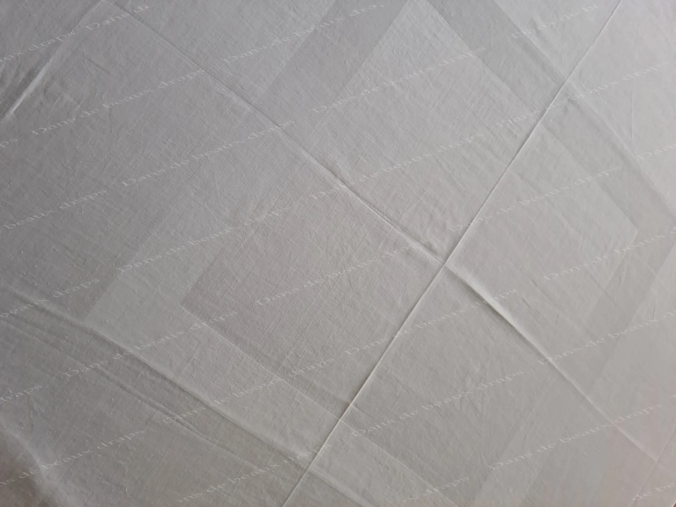 La nappe est lavée, repassée et bien blanche, elle apparait plus foncée pour faire ressortir les motifs sur les photos.