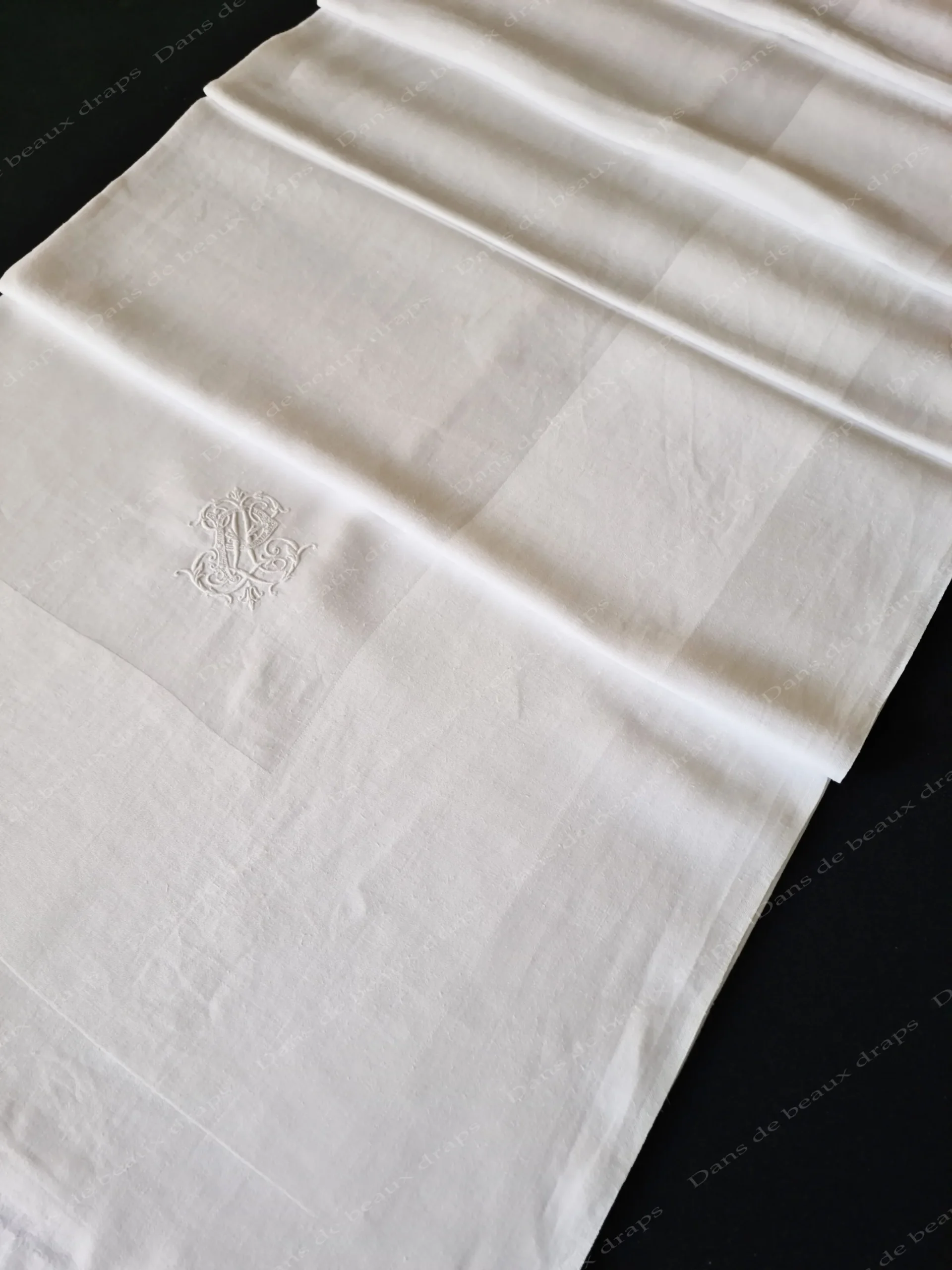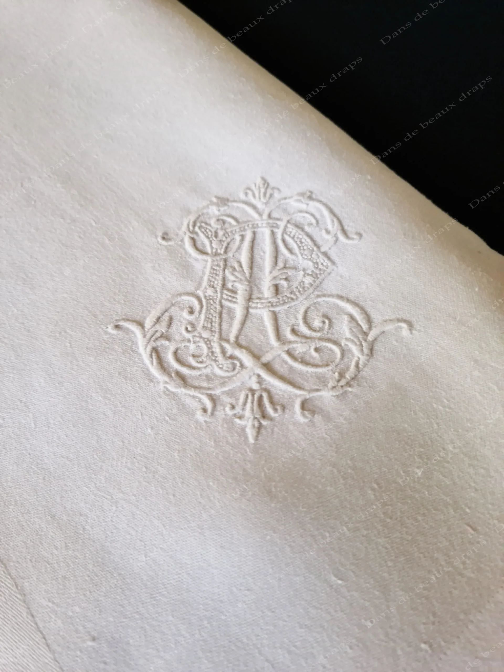 Dans un angle, monogrammes LP entrelacé ( 7 cm par 7 cm) et fleurdelisé ,brodé merveilleusement au point de bourdon et de sable.