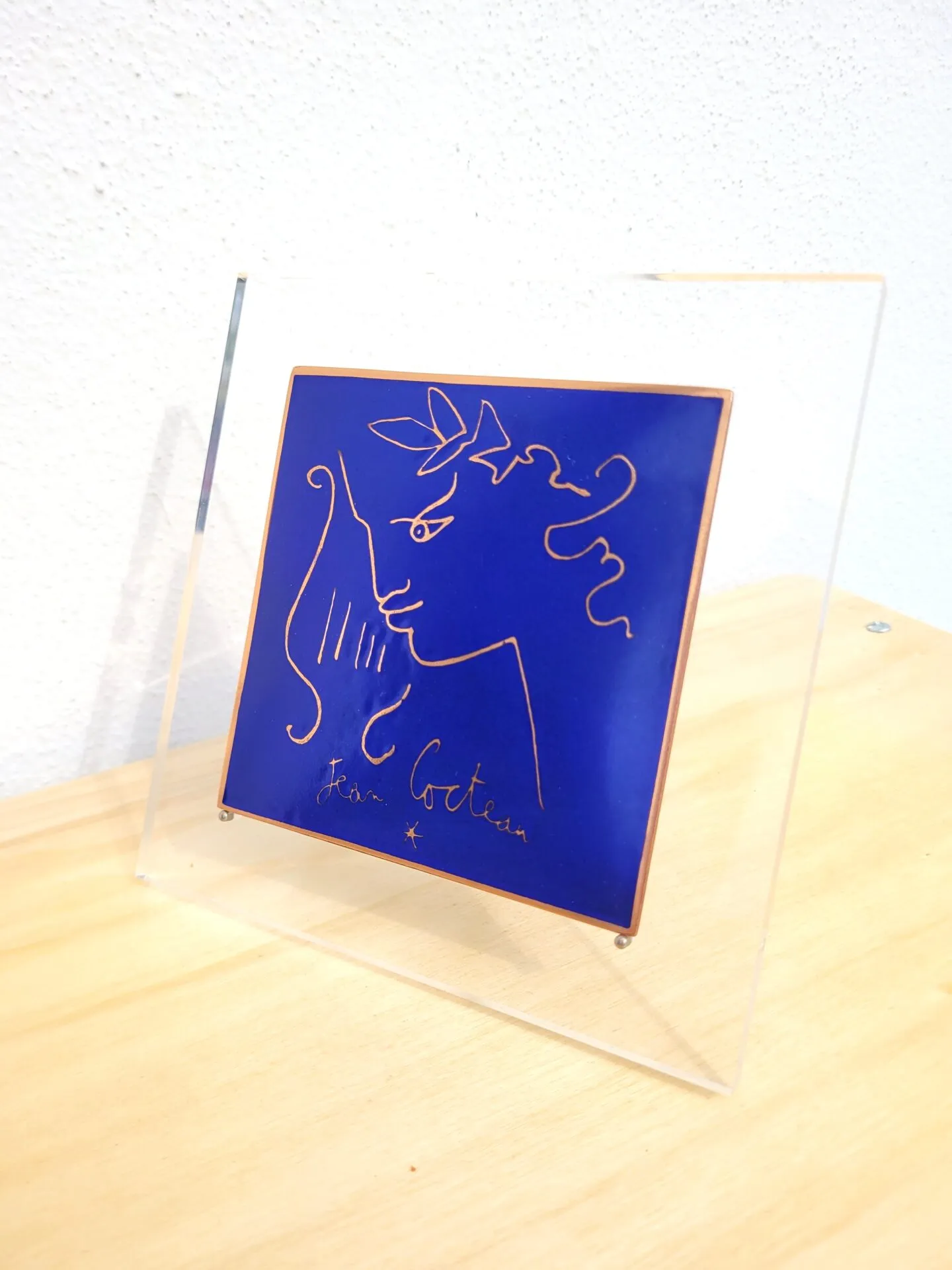 Le carreau est sur plaque de cuivre, présenté sur un support en plexiglas transparent à poser, un bel objet de décoration, en très bon état