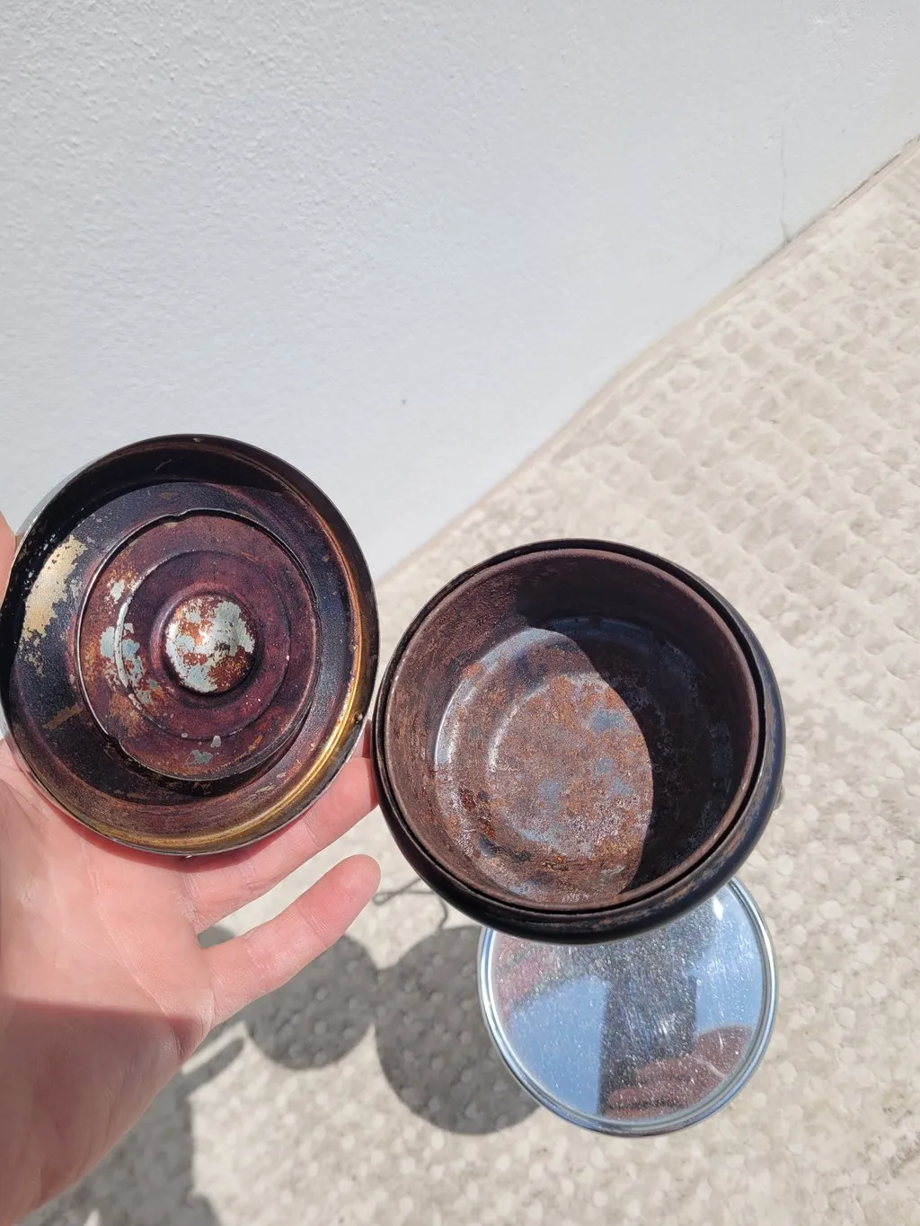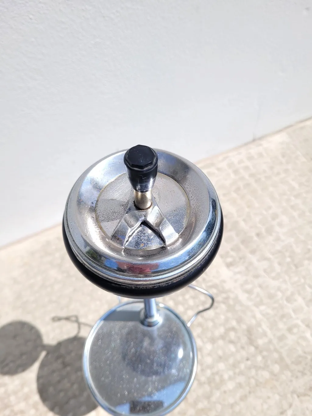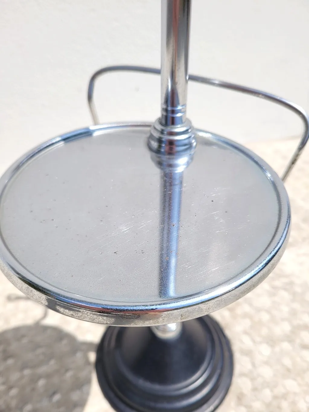 Le contenant / cendrier est démontable pour le nettoyage (oxydation), on trouve dessous une petite tablette ronde quasi miroir et un porte journal.
