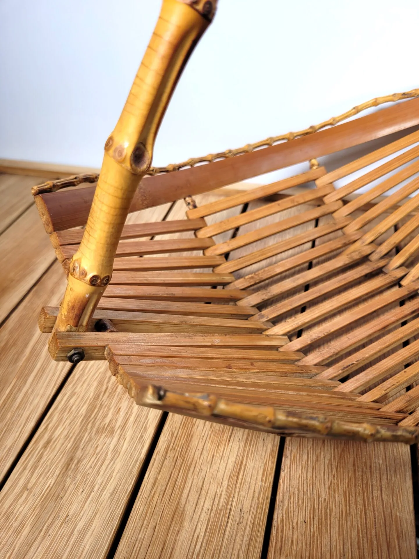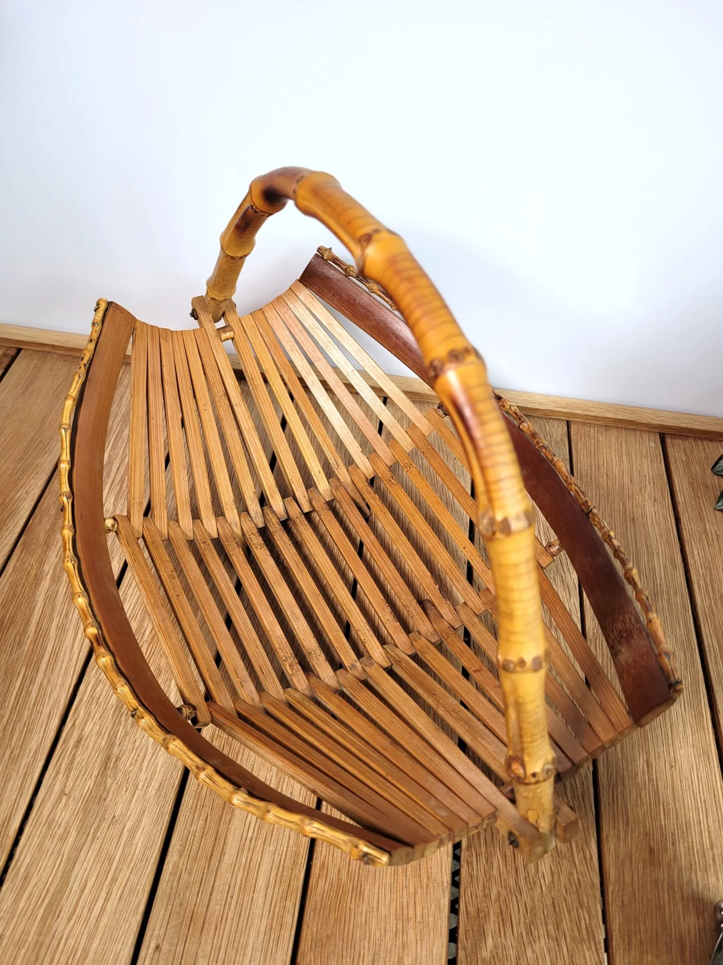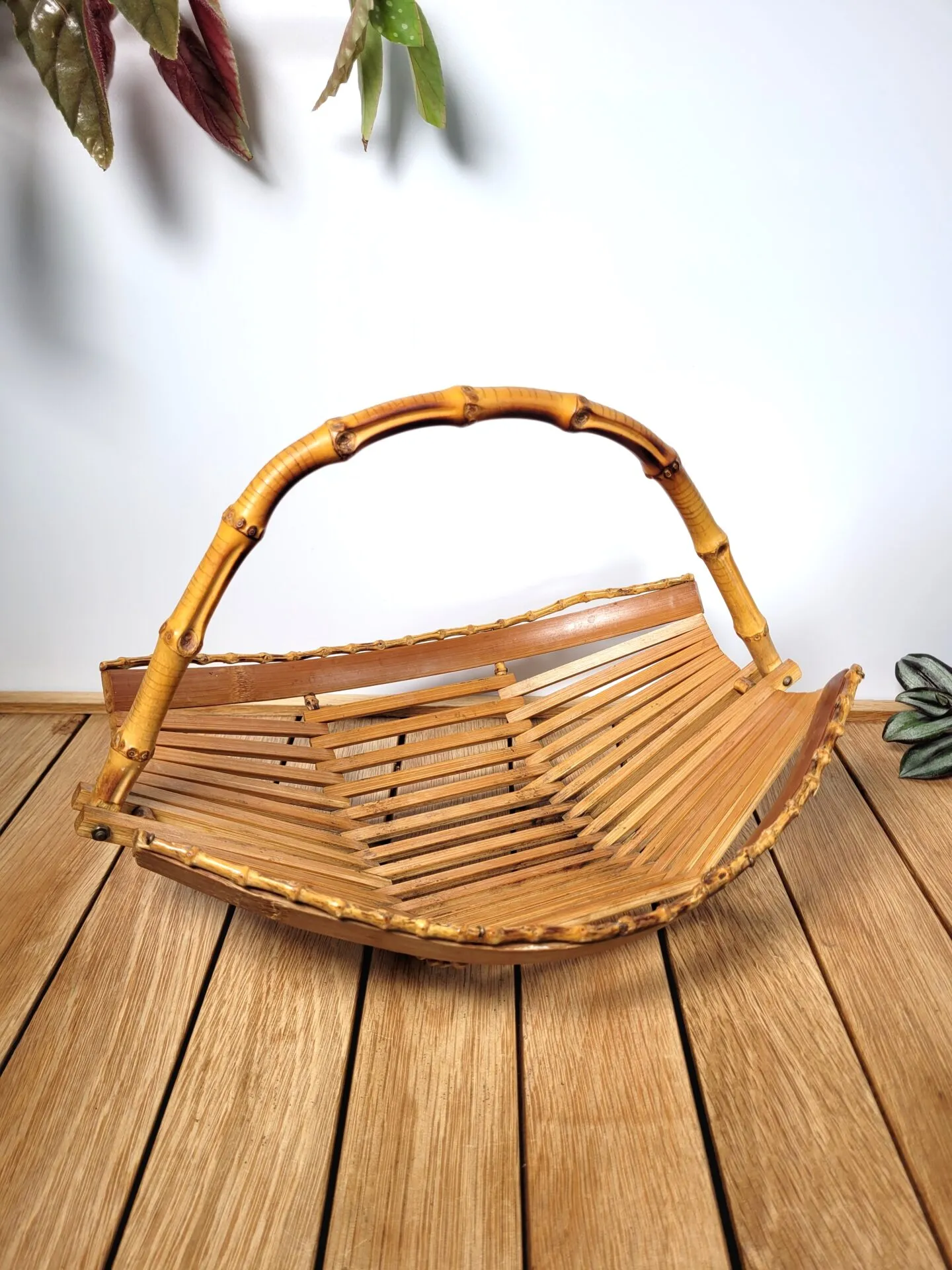 Elle est réalisée avec un assemblage très esthétique de lattes de bambou, et de tiges pour les côtés ainsi que pour l’anse