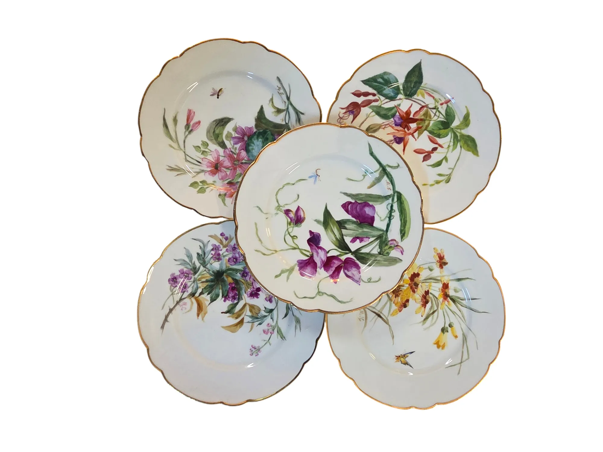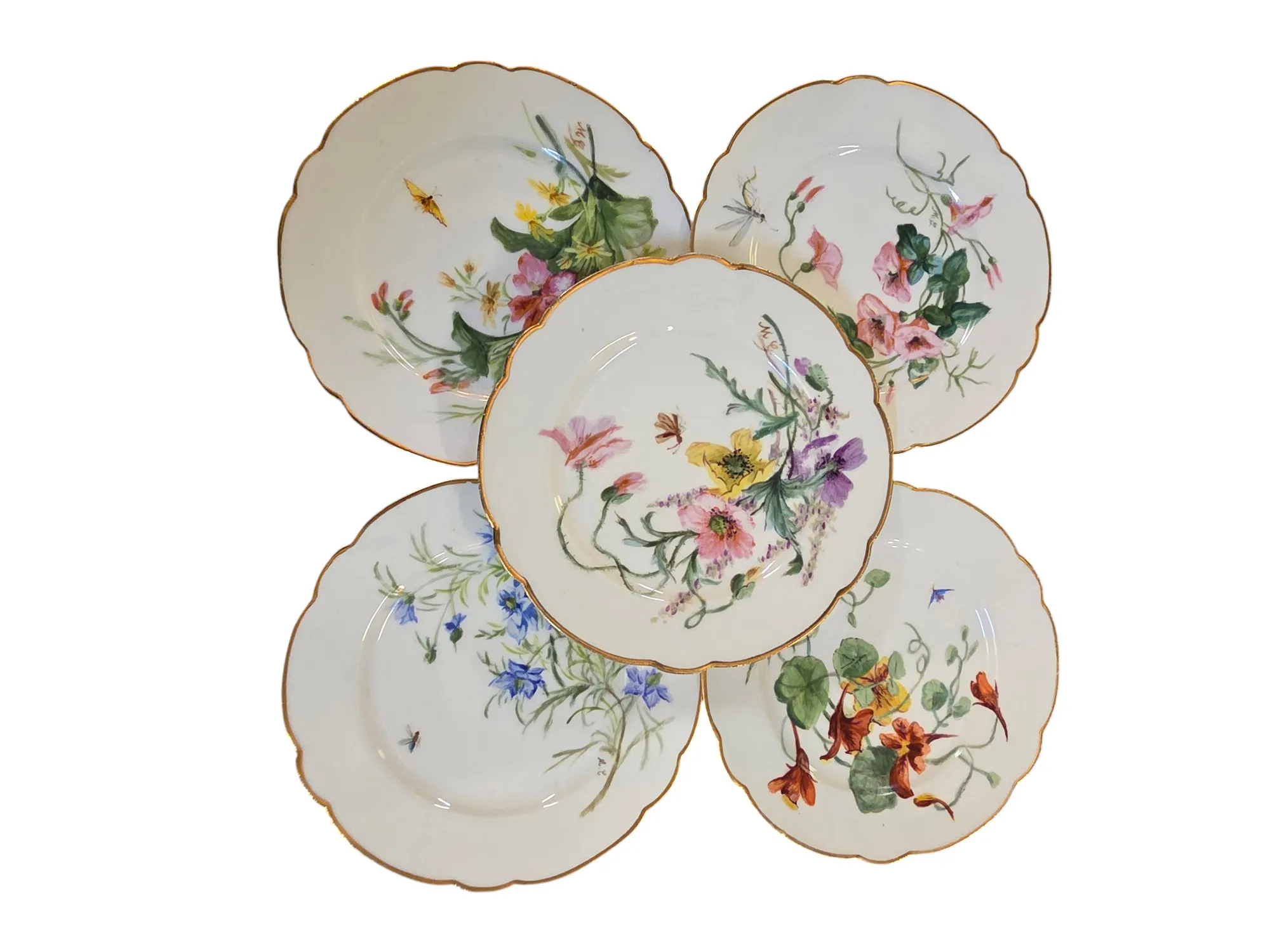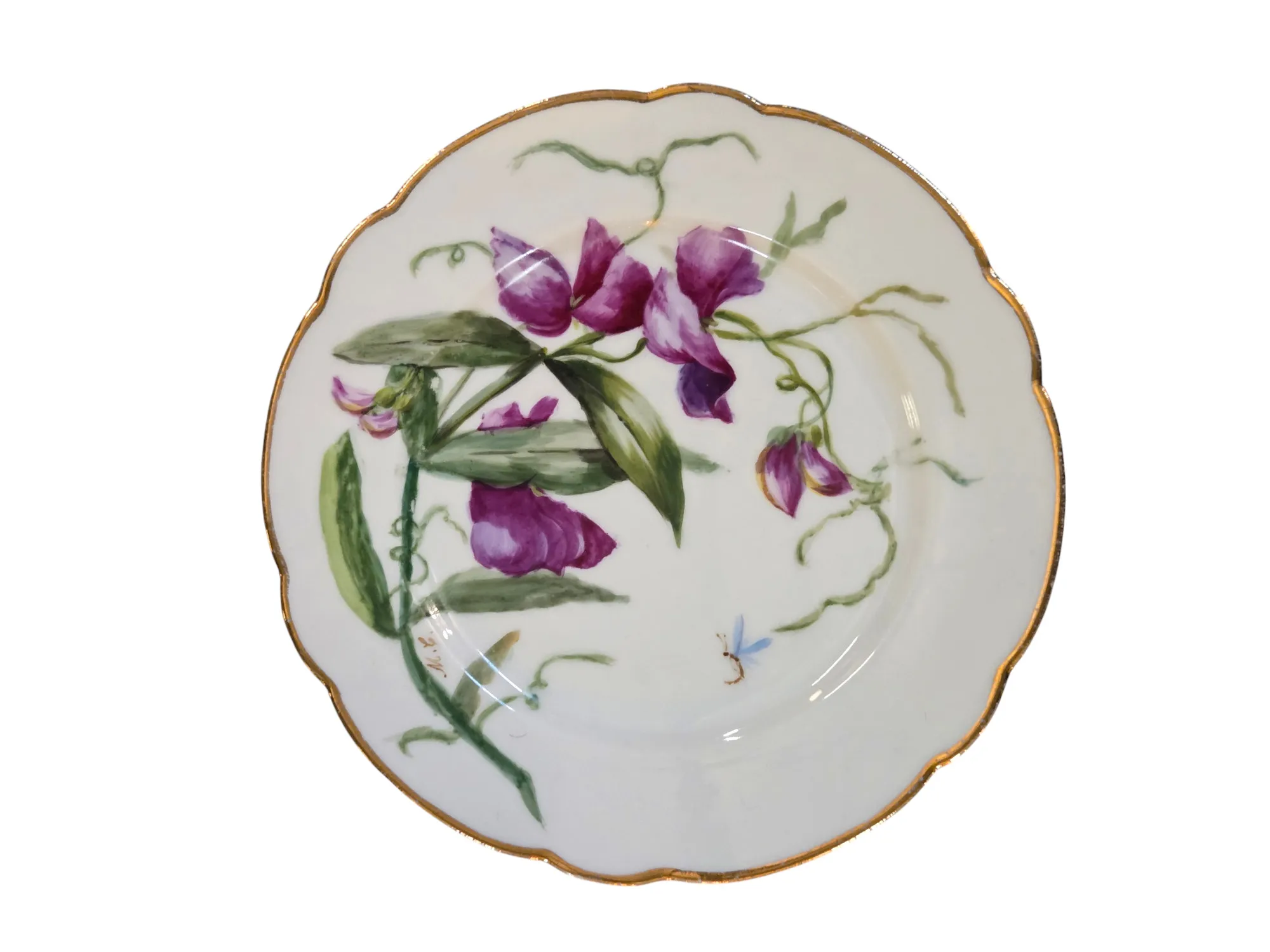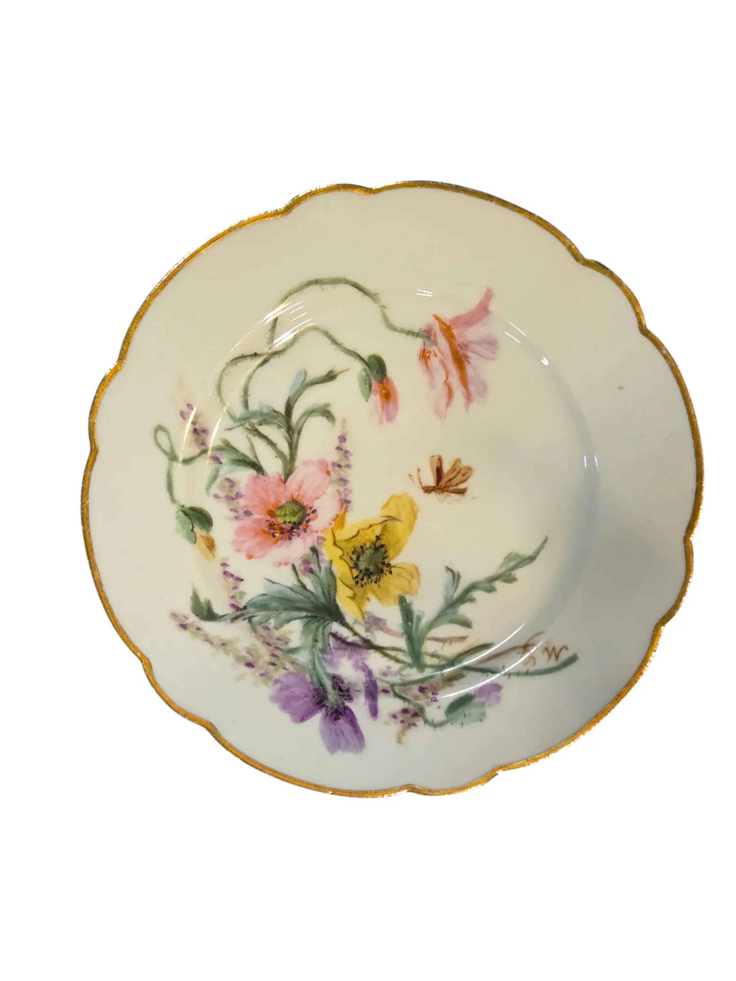 En porcelaine blanche, filet or, à bord chantourné, à décor de fleurs polychrome et d’insectes.