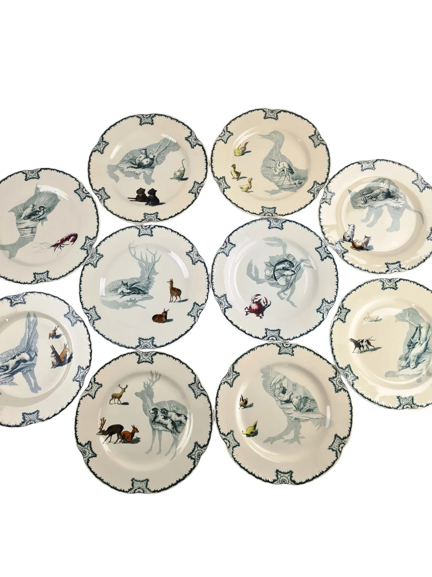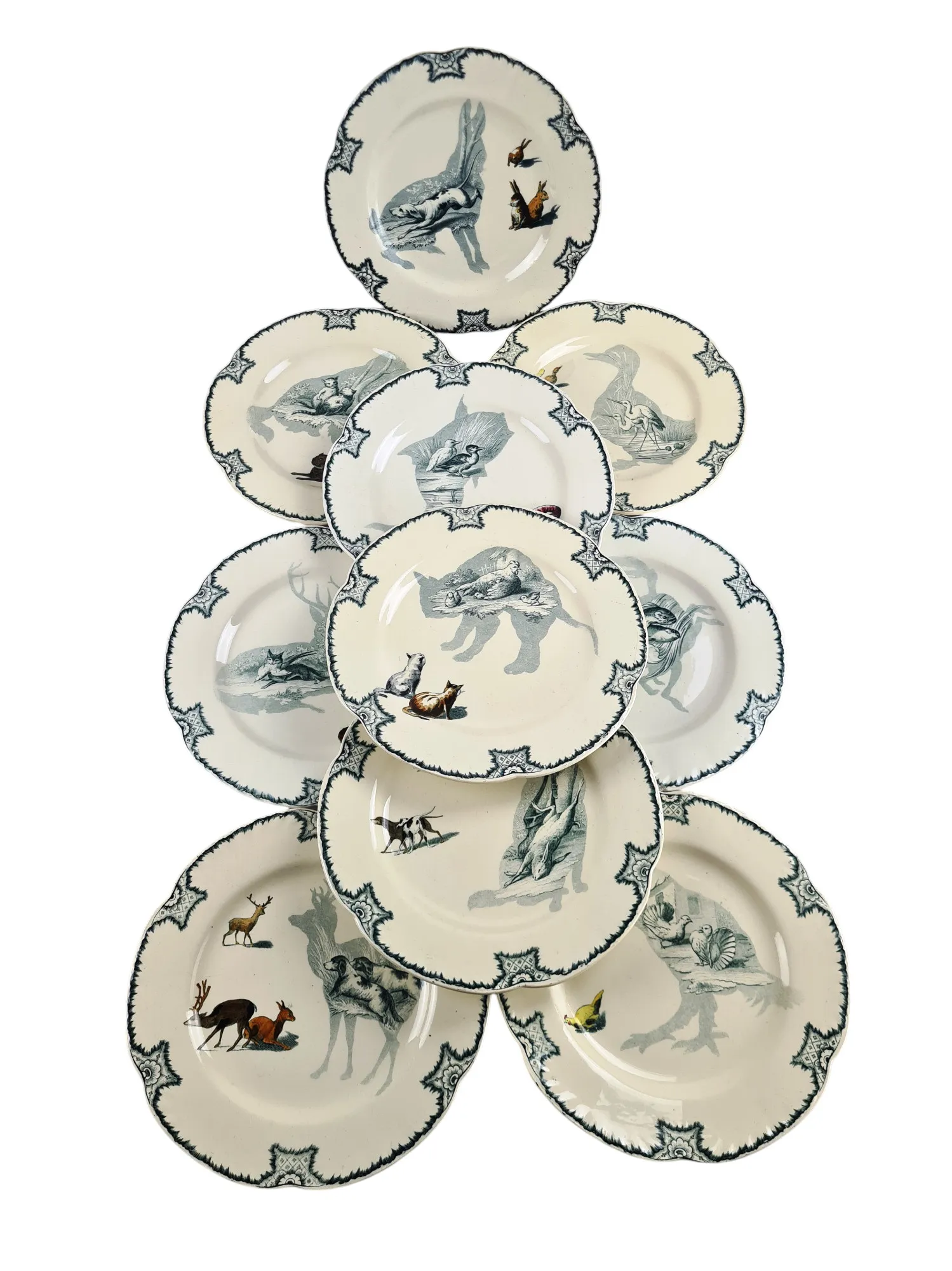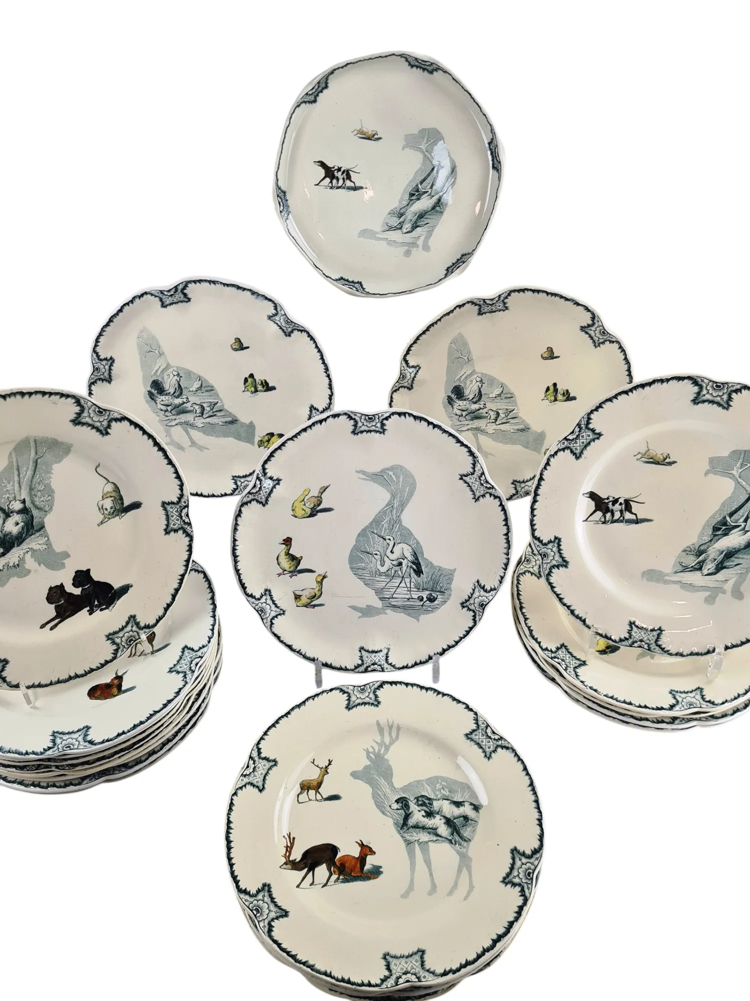En faïence polychrome et au naturel (effets de grisaille), chaque pièce présente des animaux en grisaille dans une silhouette reproduite en polychromie.