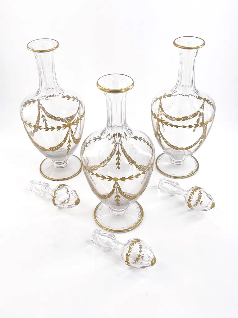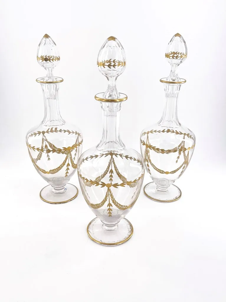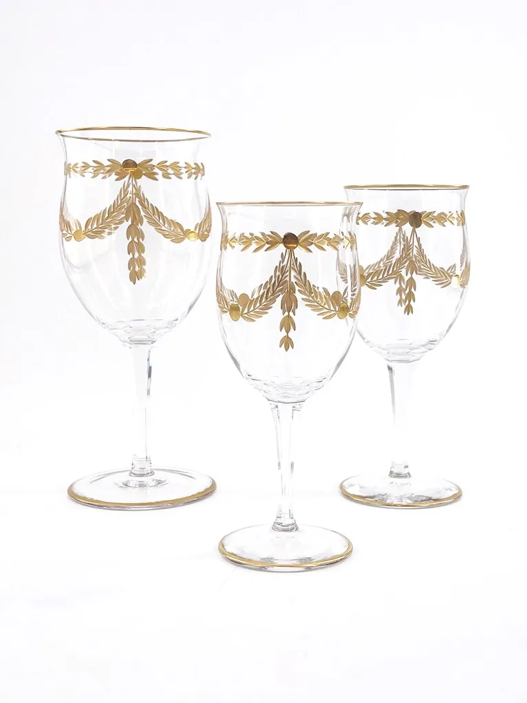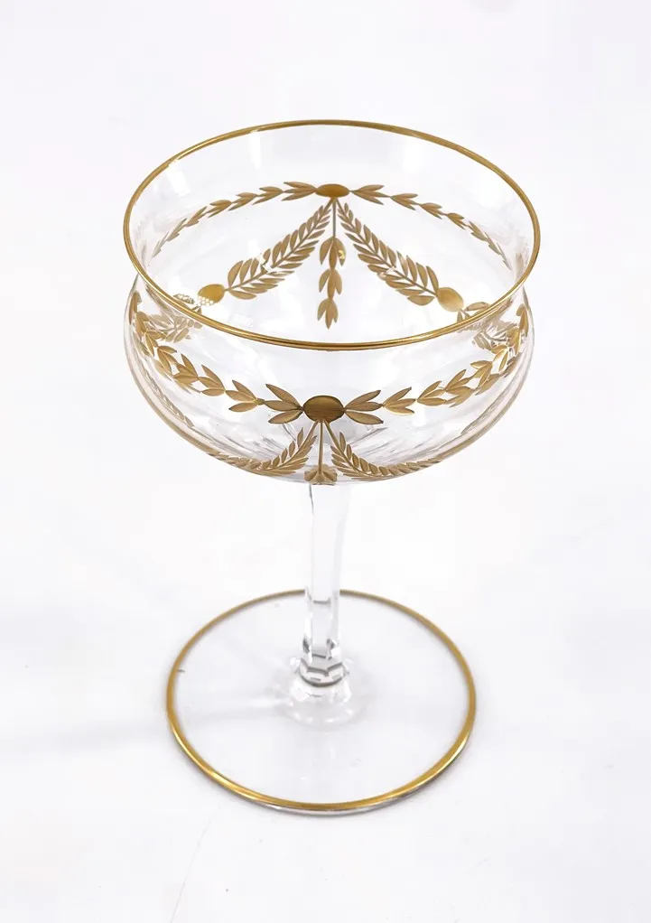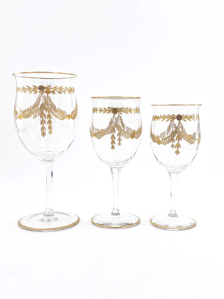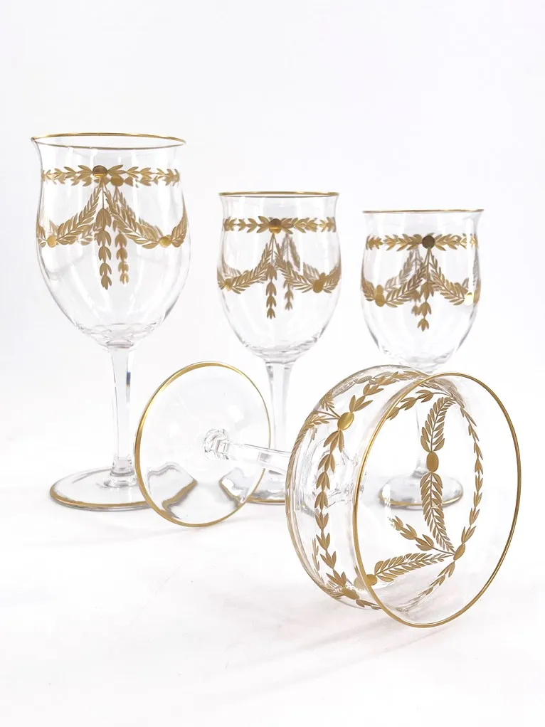 En cristal blanc, jambe balustre, pied rond filet or et buvant tulipe gravé à la roue de guirlandes de feuillage rehaussées à l’or.