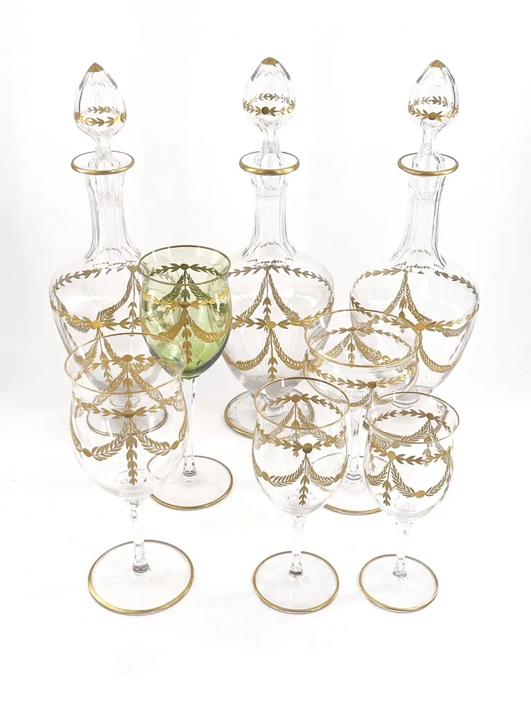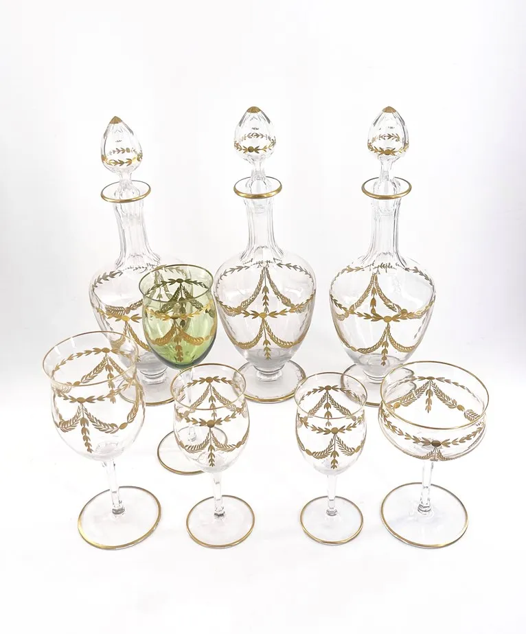 Le service comprend 12 verres à eau, 12 verres à vin rouge, 12 verres à vin blanc, 12 coupes à champagne et 12 verres à vin du Rhin vert absinthe et 3 carafes à vin.