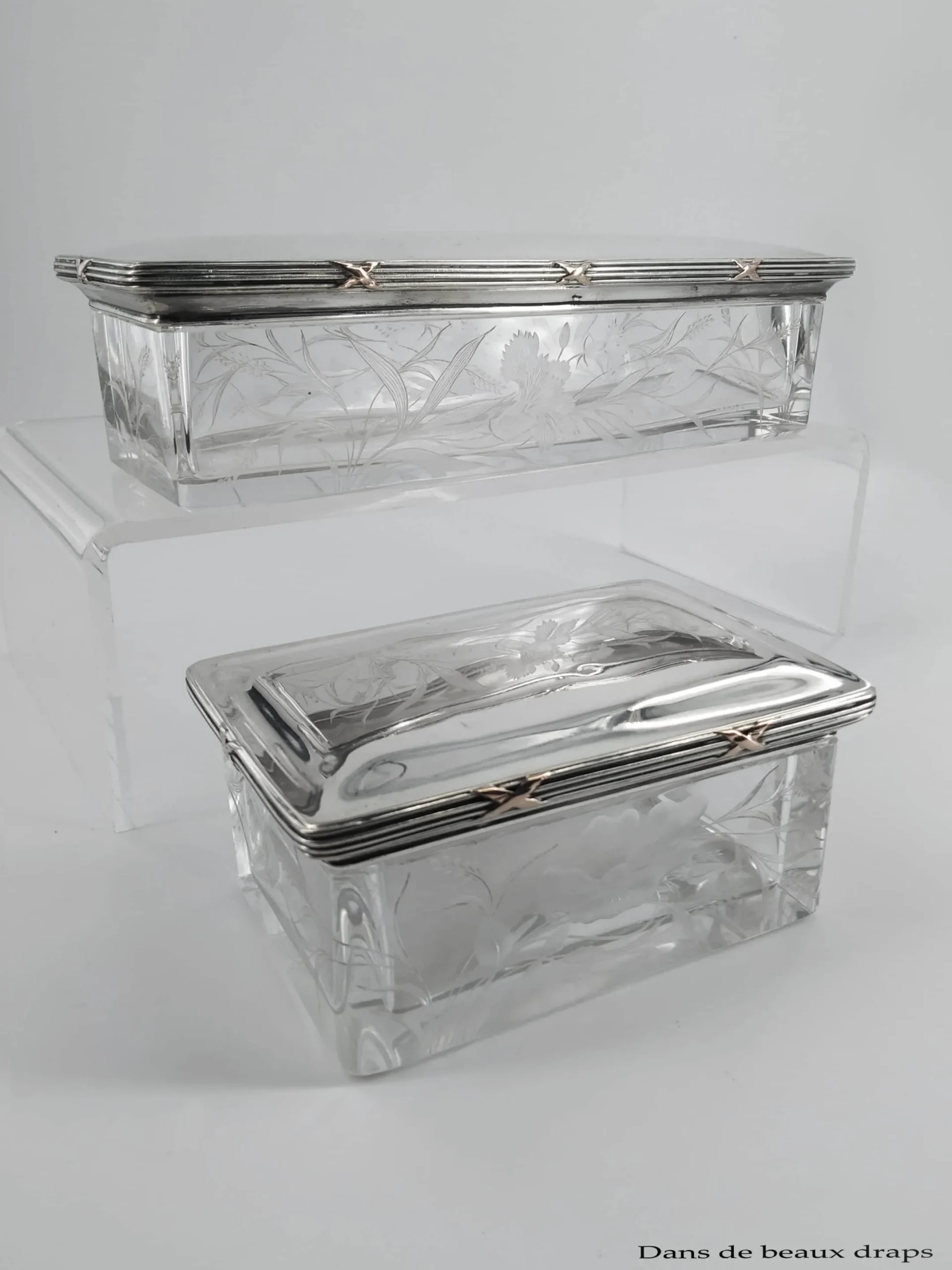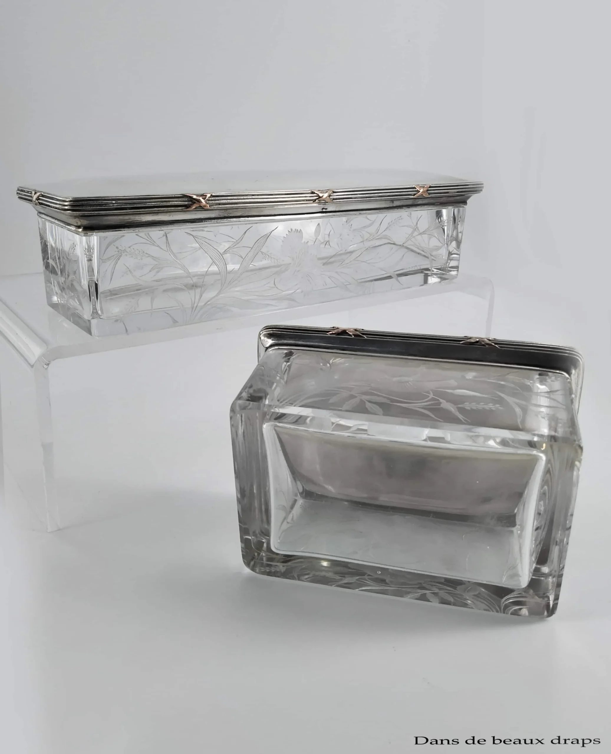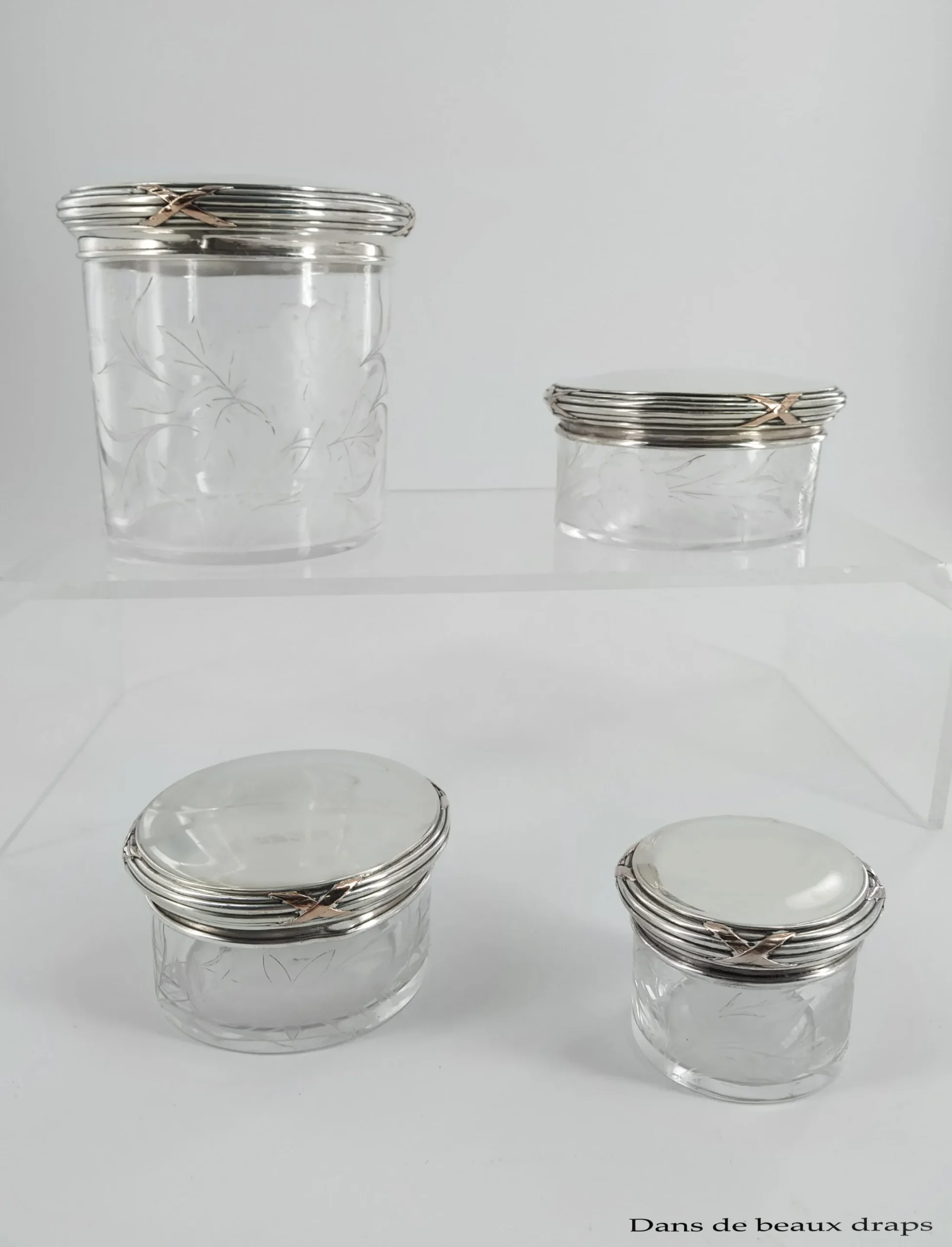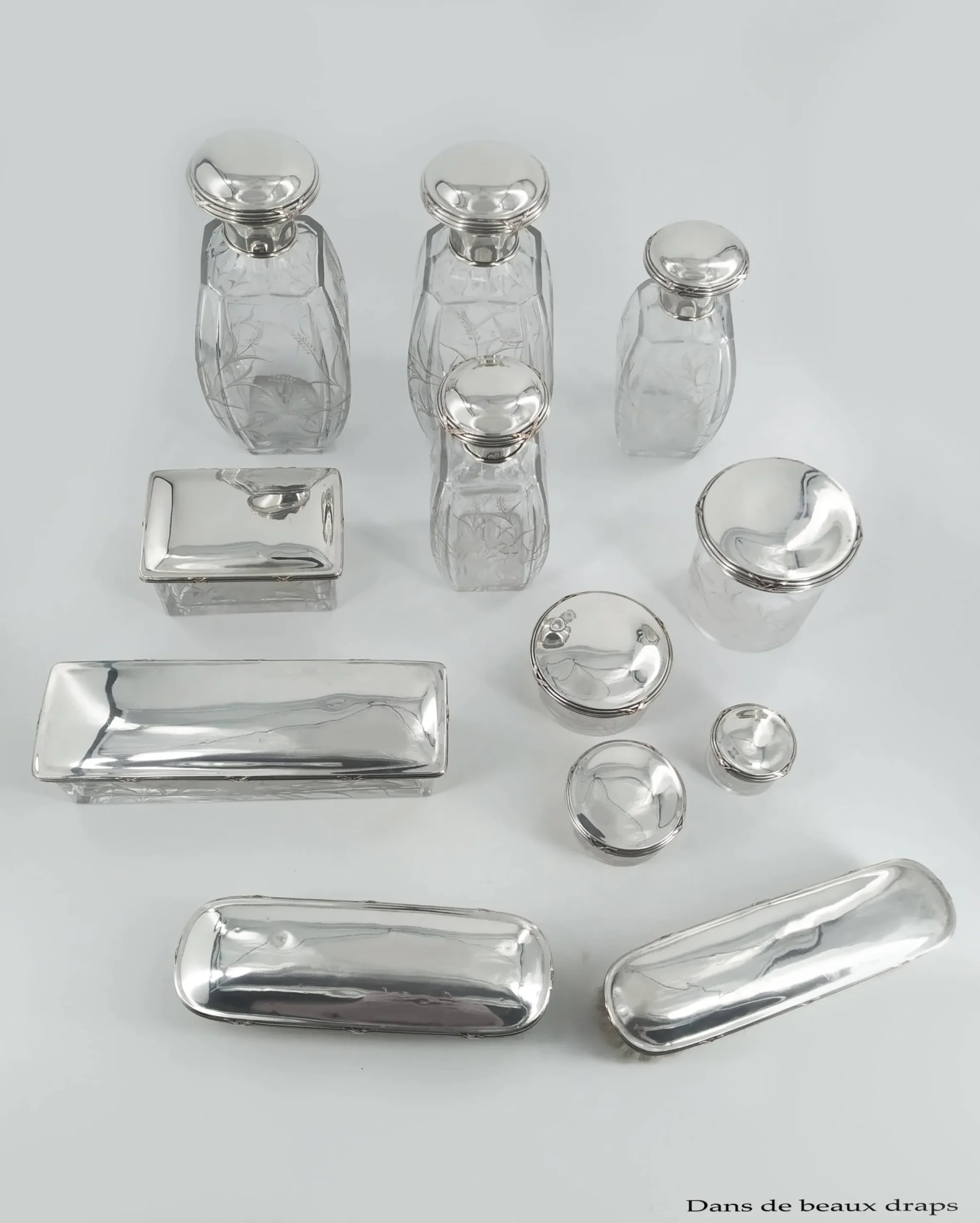 Soyez le premier à laisser votre avis sur “Exceptionnelle garniture de toilette en cristal gravé et argent, époque art nouveau,9 pièces”