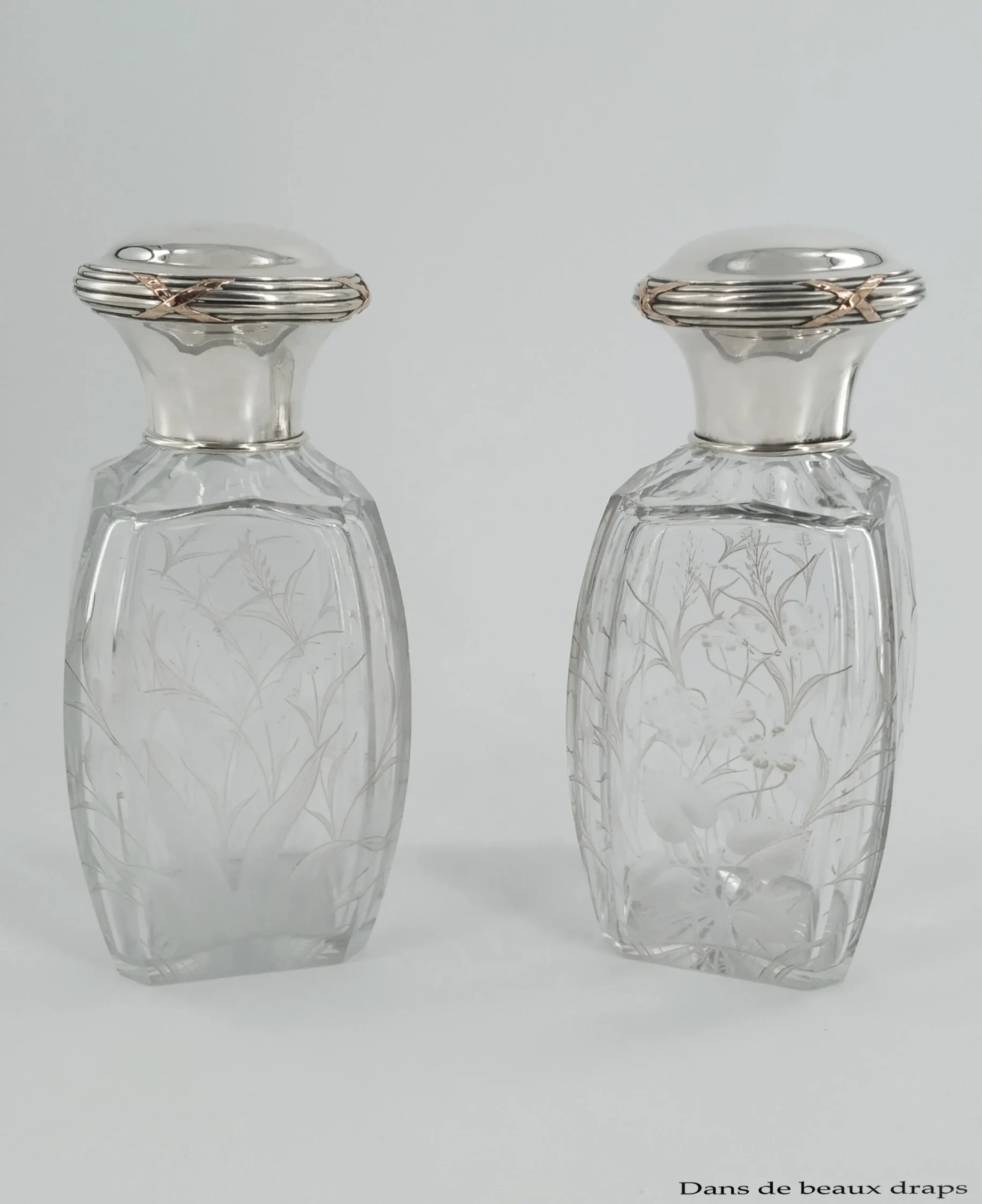 Bague argent sur les flacons et la prise des bouchons intérieurs, surbouchons en argent et vermeil.